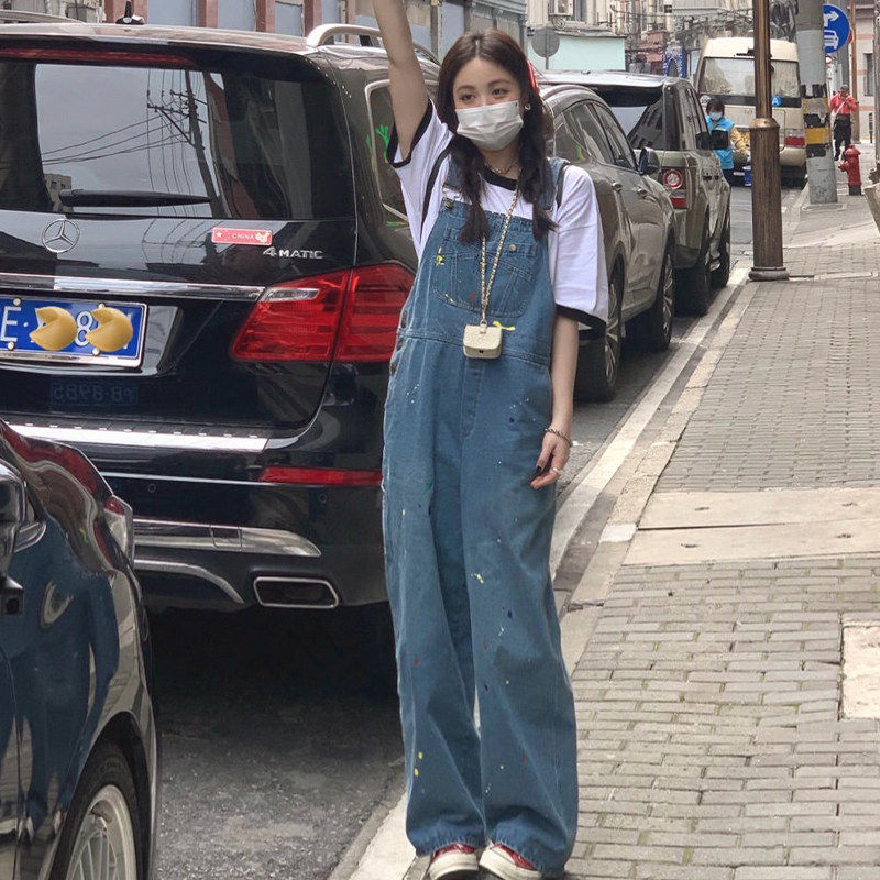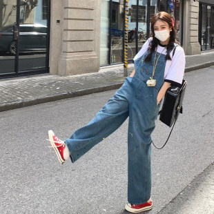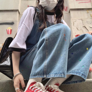 涂鸦直筒宽松百搭减龄连体长裤 甜酷工装 女春夏新款 背带裤 风牛仔裤