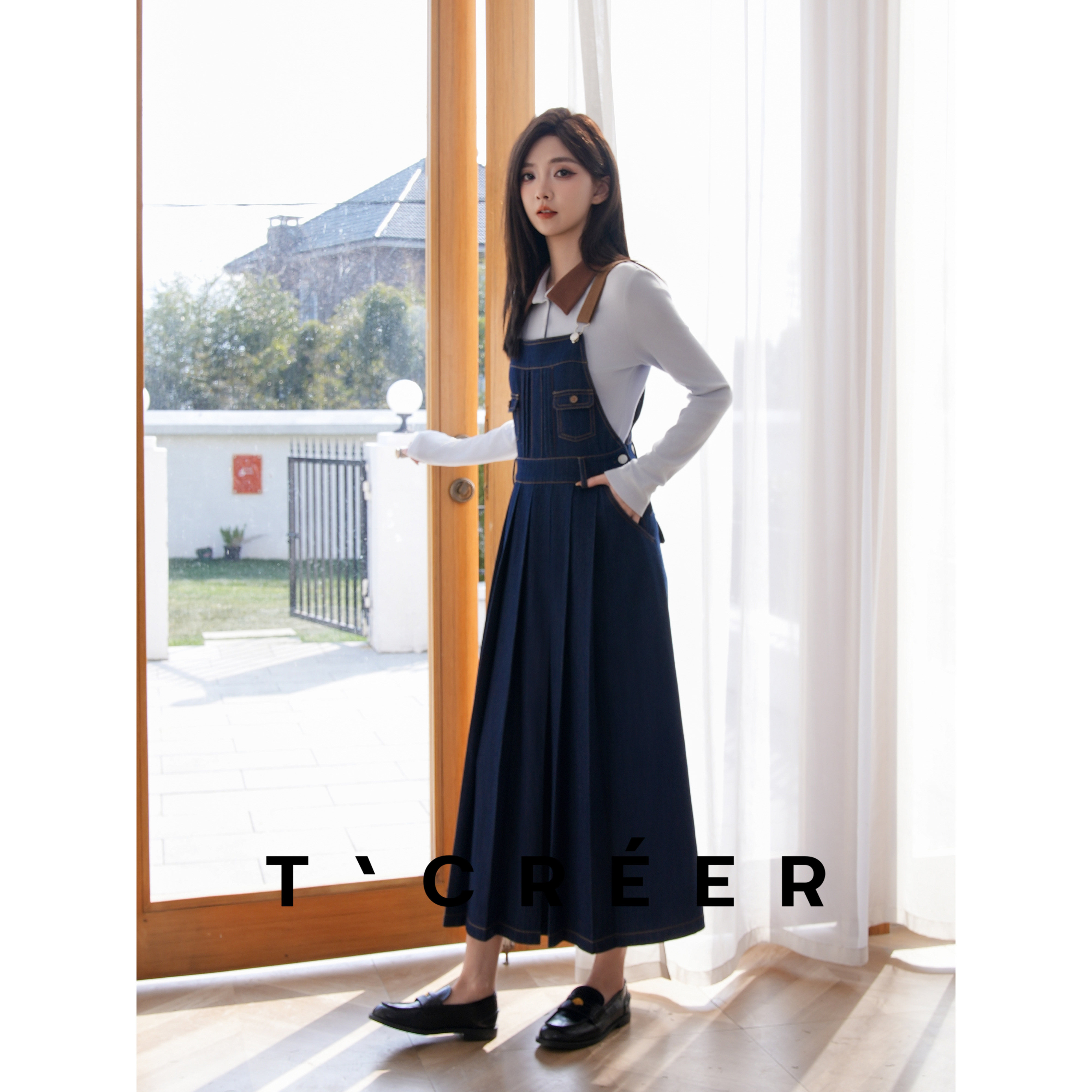 T`CREER| 韩系文艺学院解构百褶休闲背带半身裙女 午夜轮廓