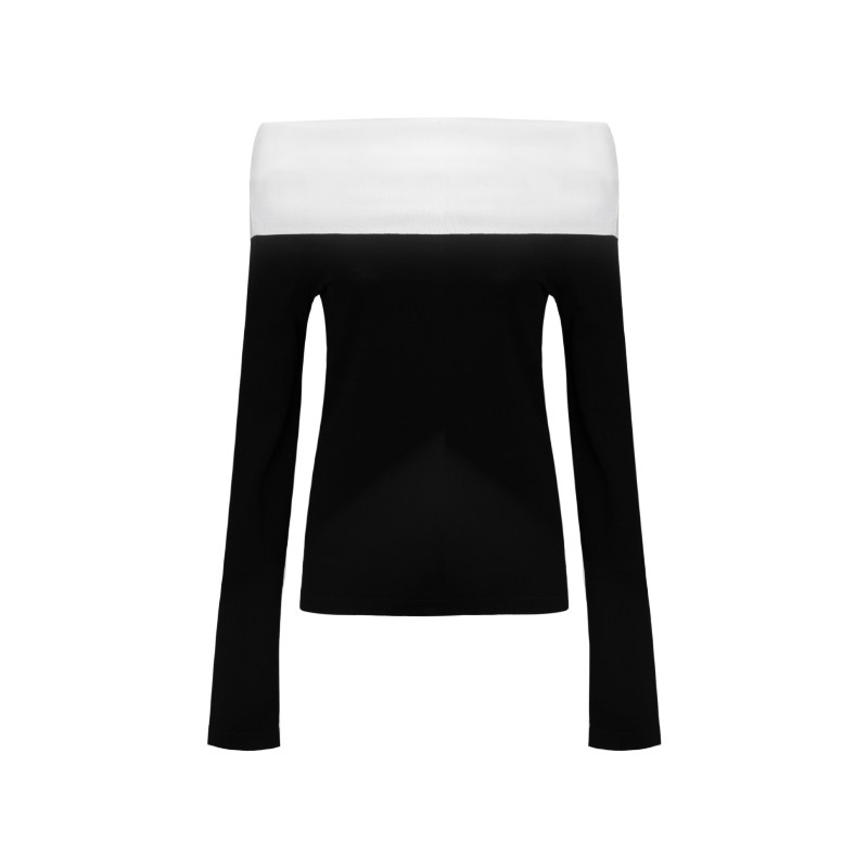 t恤 高级感简约风长袖 Bettychow 露肩弹力针织黑白拼色上衣法式