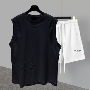 t恤套装 五分裤 男夏季 潮流百搭帅气学生宽松直筒裤 韩版 假两件无袖