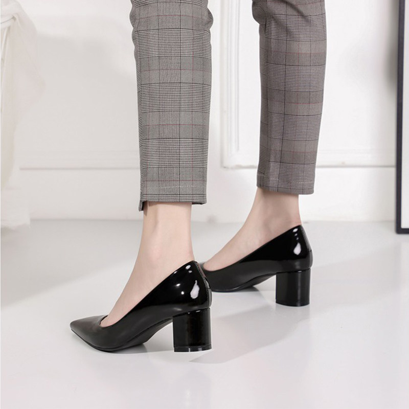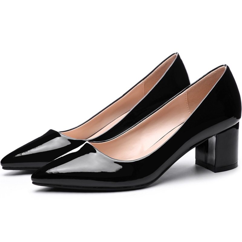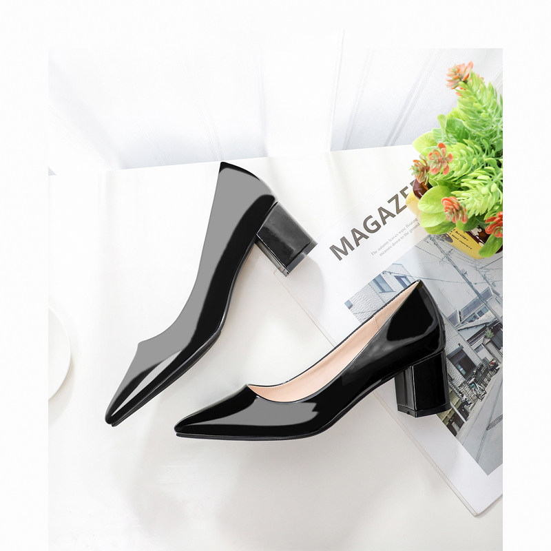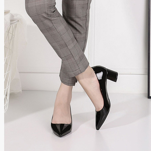 百搭少女小清新工作鞋 黑色上班高跟鞋 女粗跟尖头5cm漆皮中跟包鞋