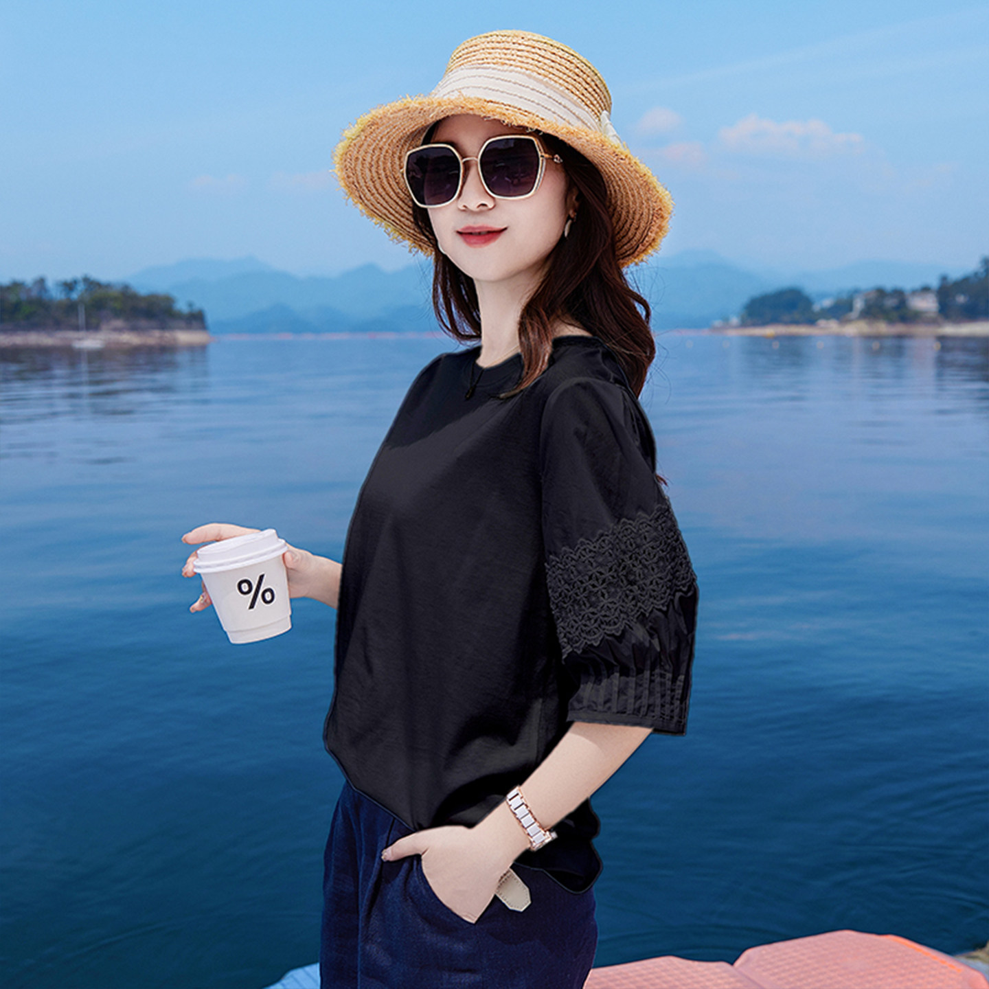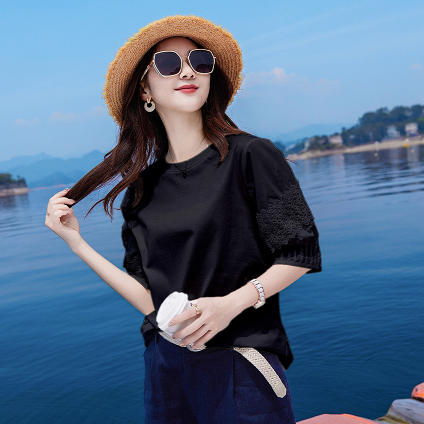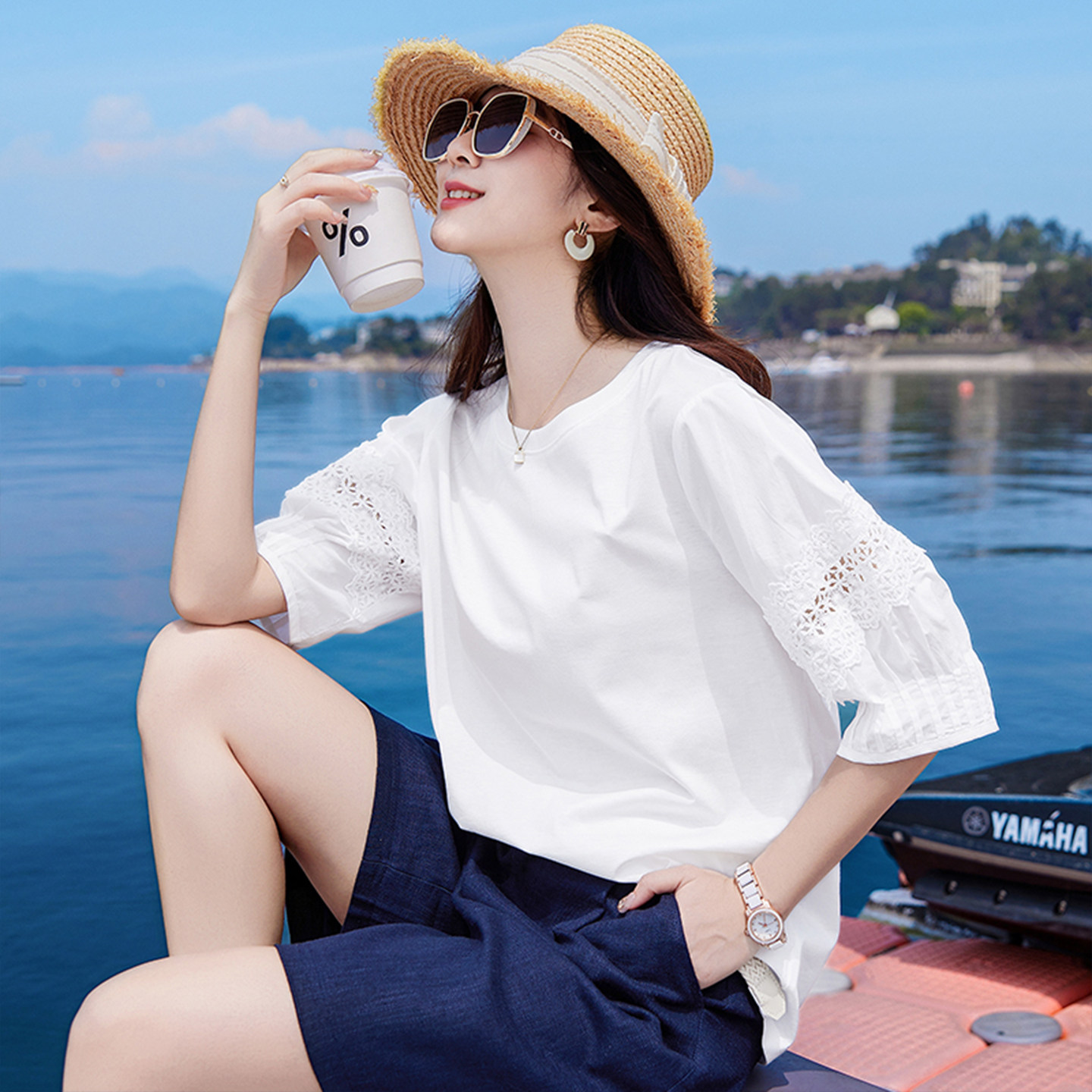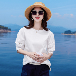 蕾丝镂空宽松减龄女款 夏季 短上衣 t恤女2025新款 100%纯棉白色短袖