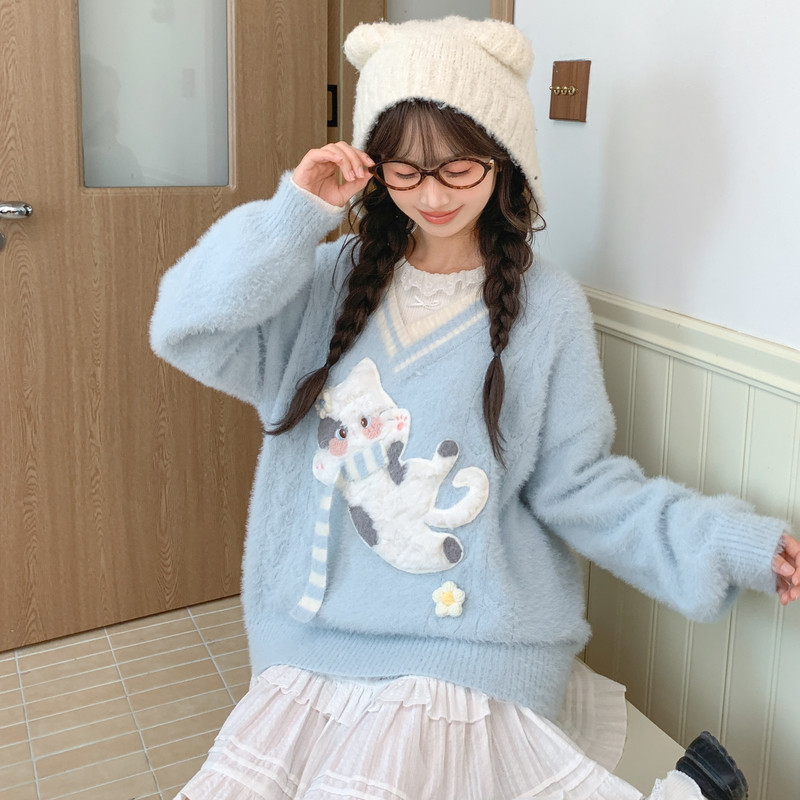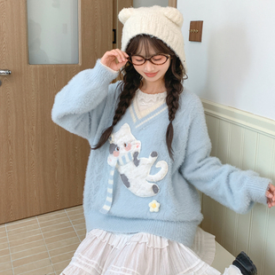 毛衣秋 森女部落甜美风猫咪刺绣V领毛衣女宽松长袖 蜜蜂欢乐社