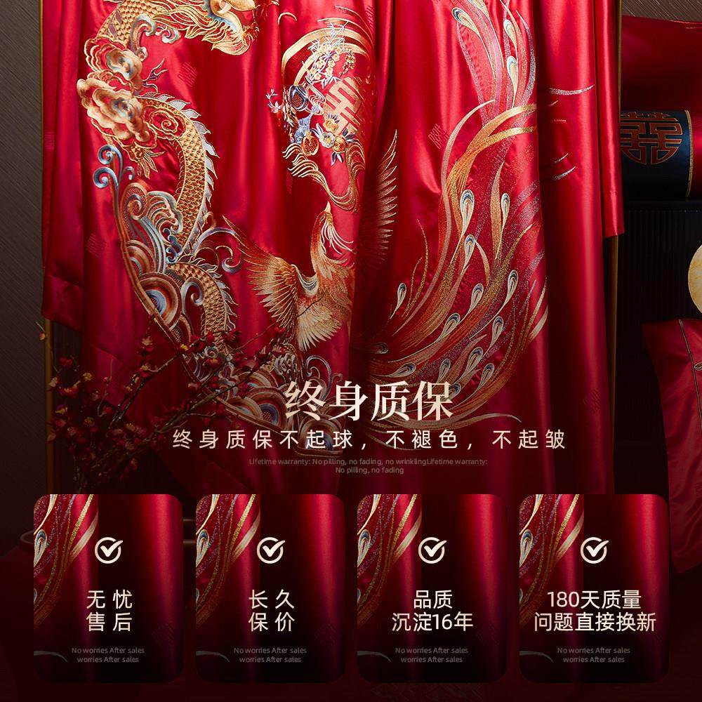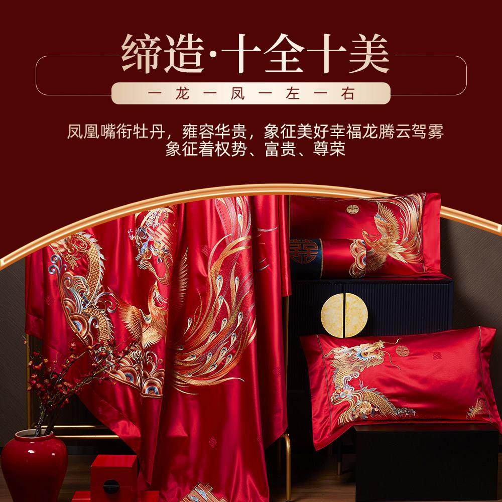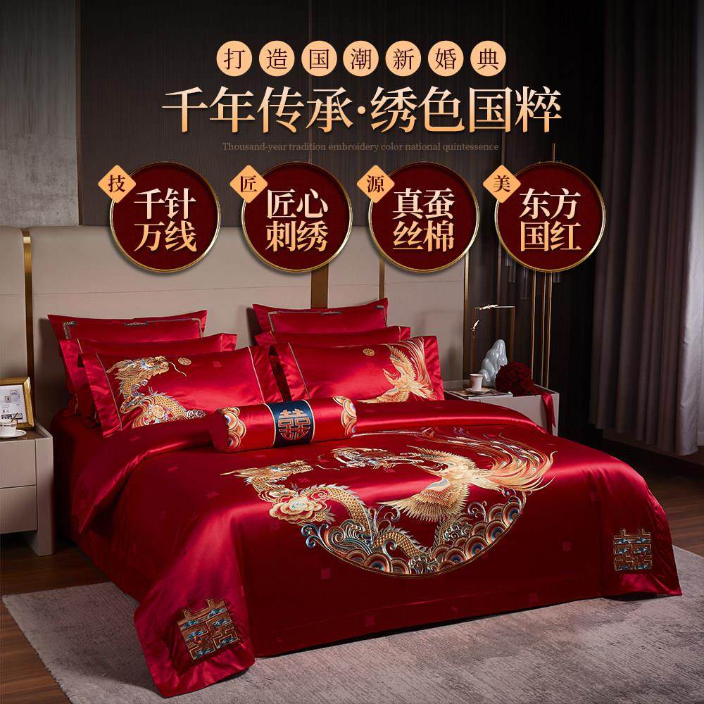 高端婚庆十件套喜嫁真丝棉刺绣大红色结婚四件套龙凤新婚床上用品