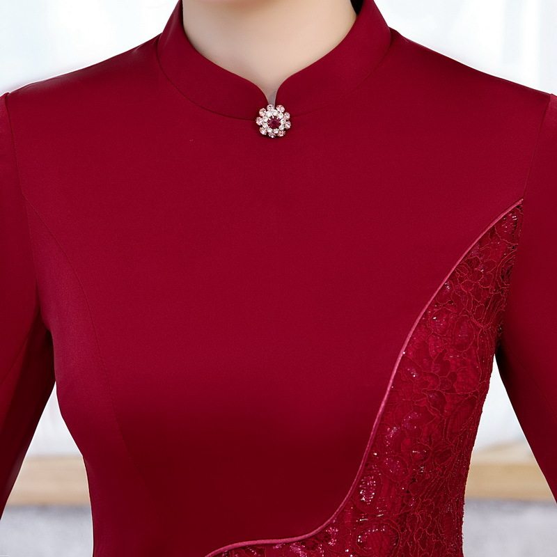 结婚短礼服 喜庆时尚 2020新款 蕾丝拼接酒红旗袍连衣裙改良修身