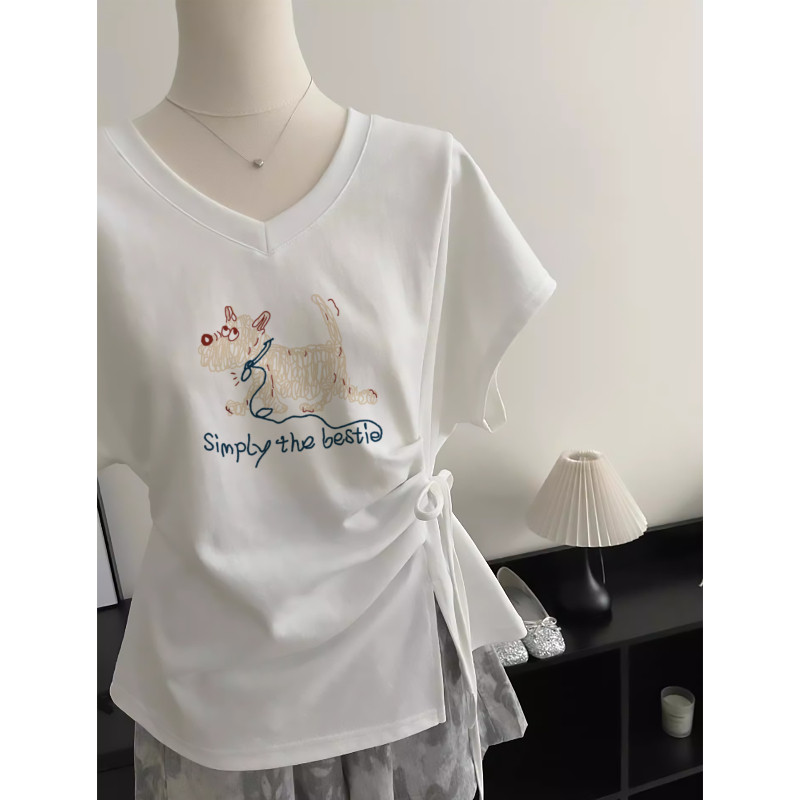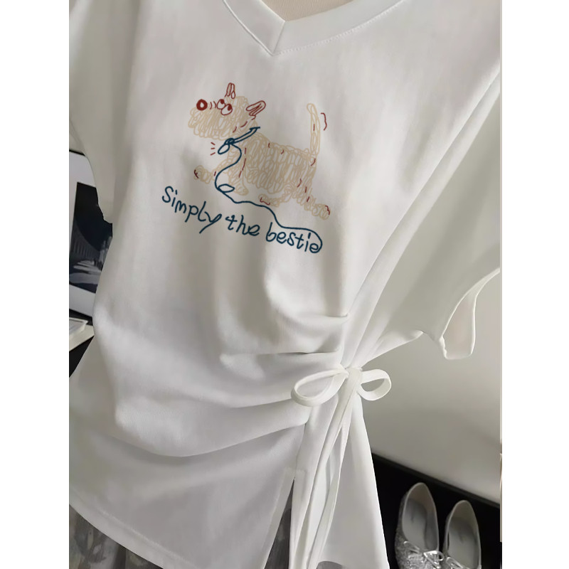 好复古好显白 T恤女高级感收腰上衣ins 不规则绑带v领白色短袖