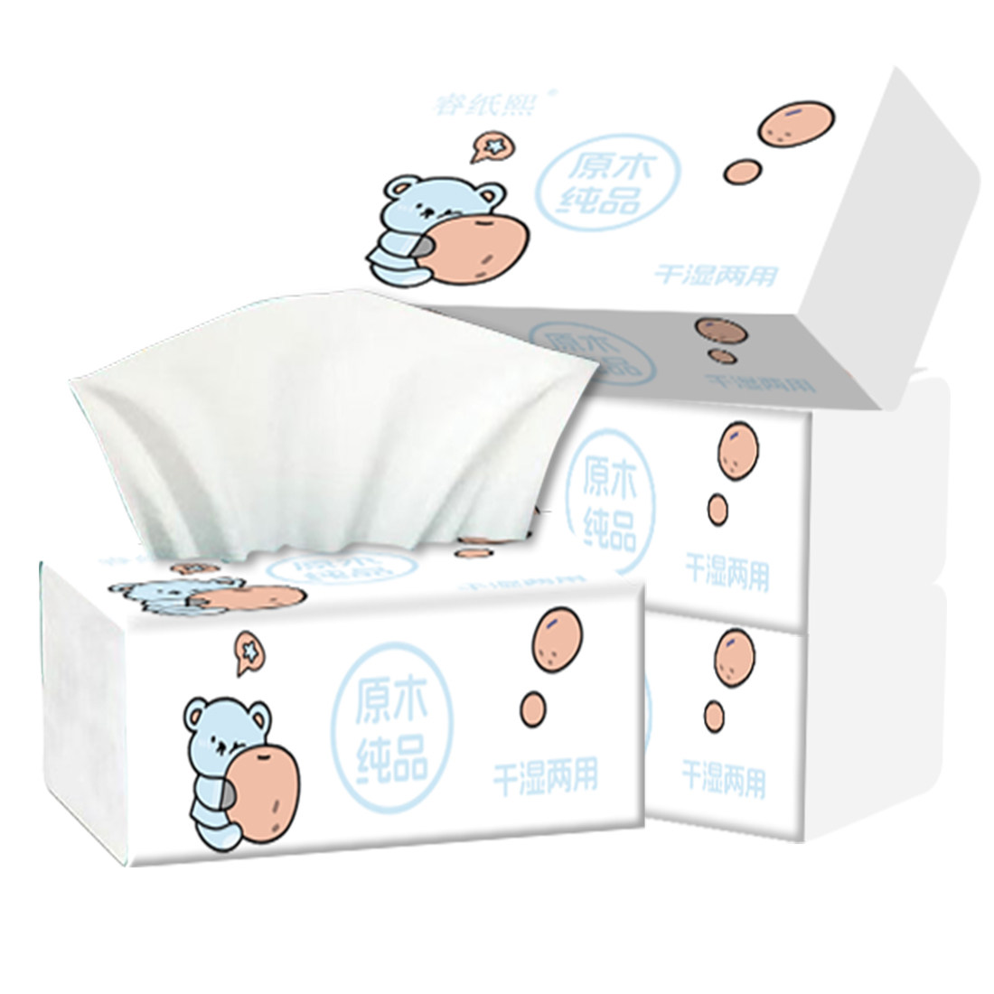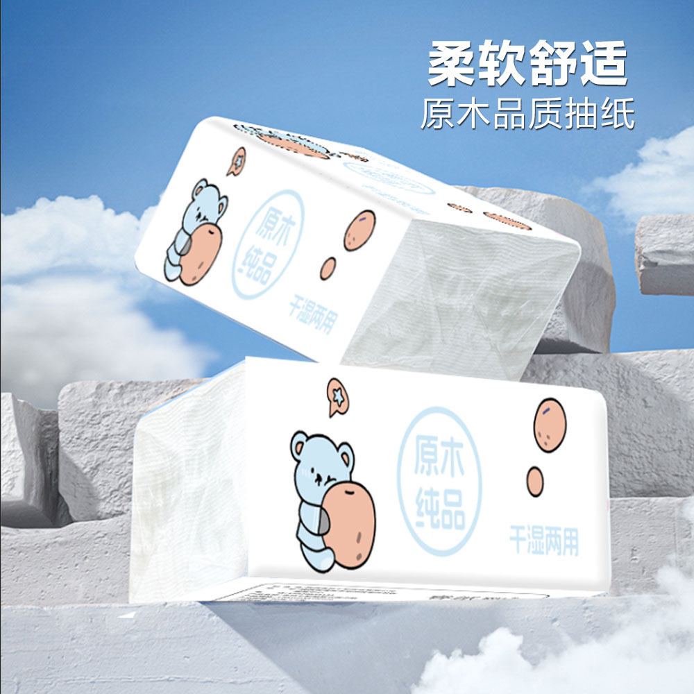 卡通小熊抽纸干湿两用家用面巾纸整箱装 原木纯品卡通图案 抽取式