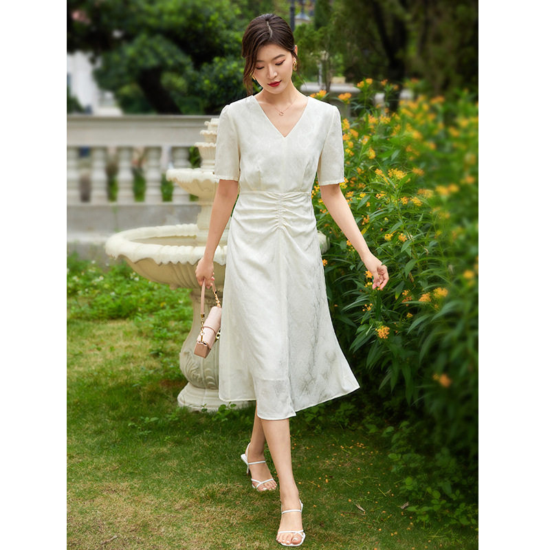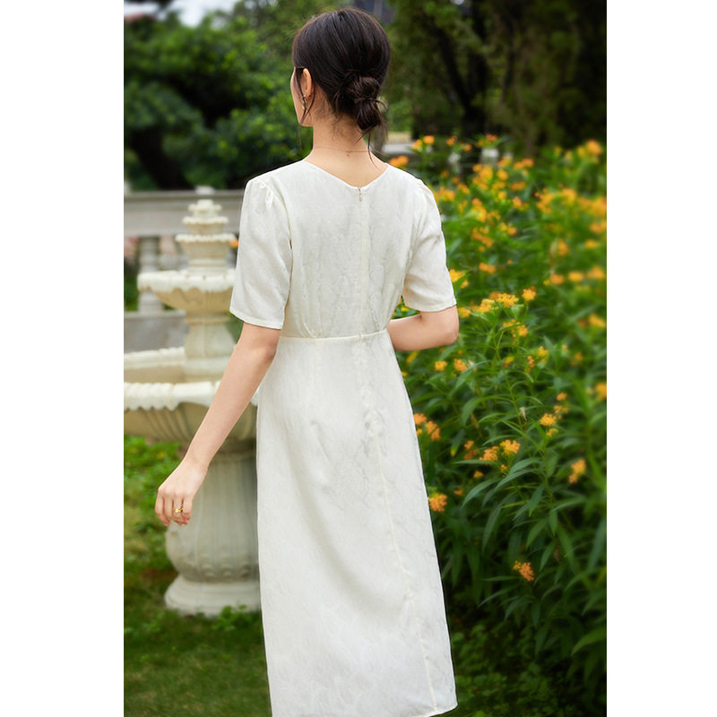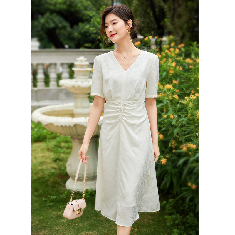 裙子 纯色高腰气质A字显瘦中长款 夏日摩登法式 仿醋酸连衣裙女短袖