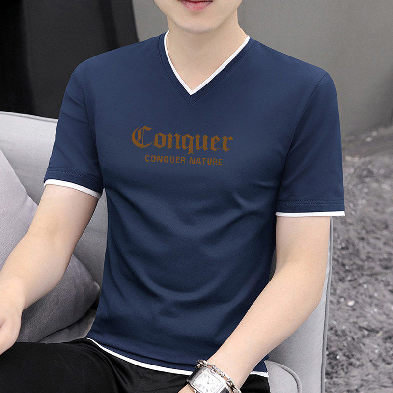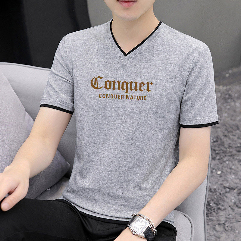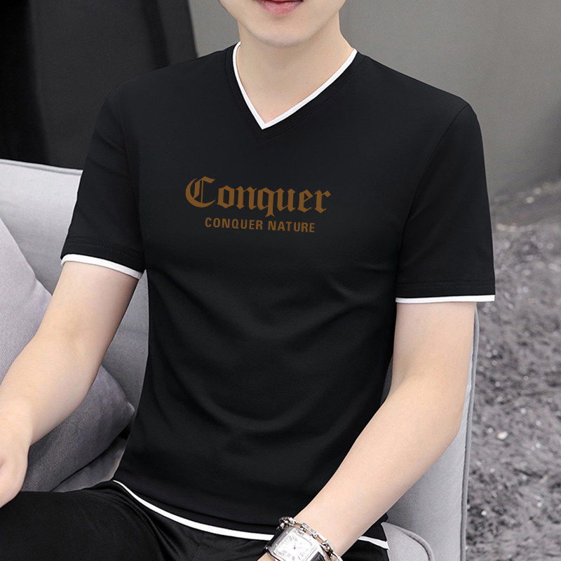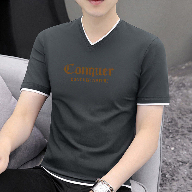t恤男纯棉2026夏季 薄款 新款 修身 透气上衣 潮流印花男士 白色V领短袖