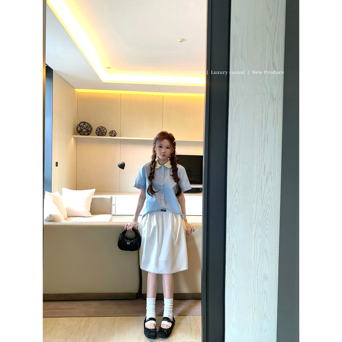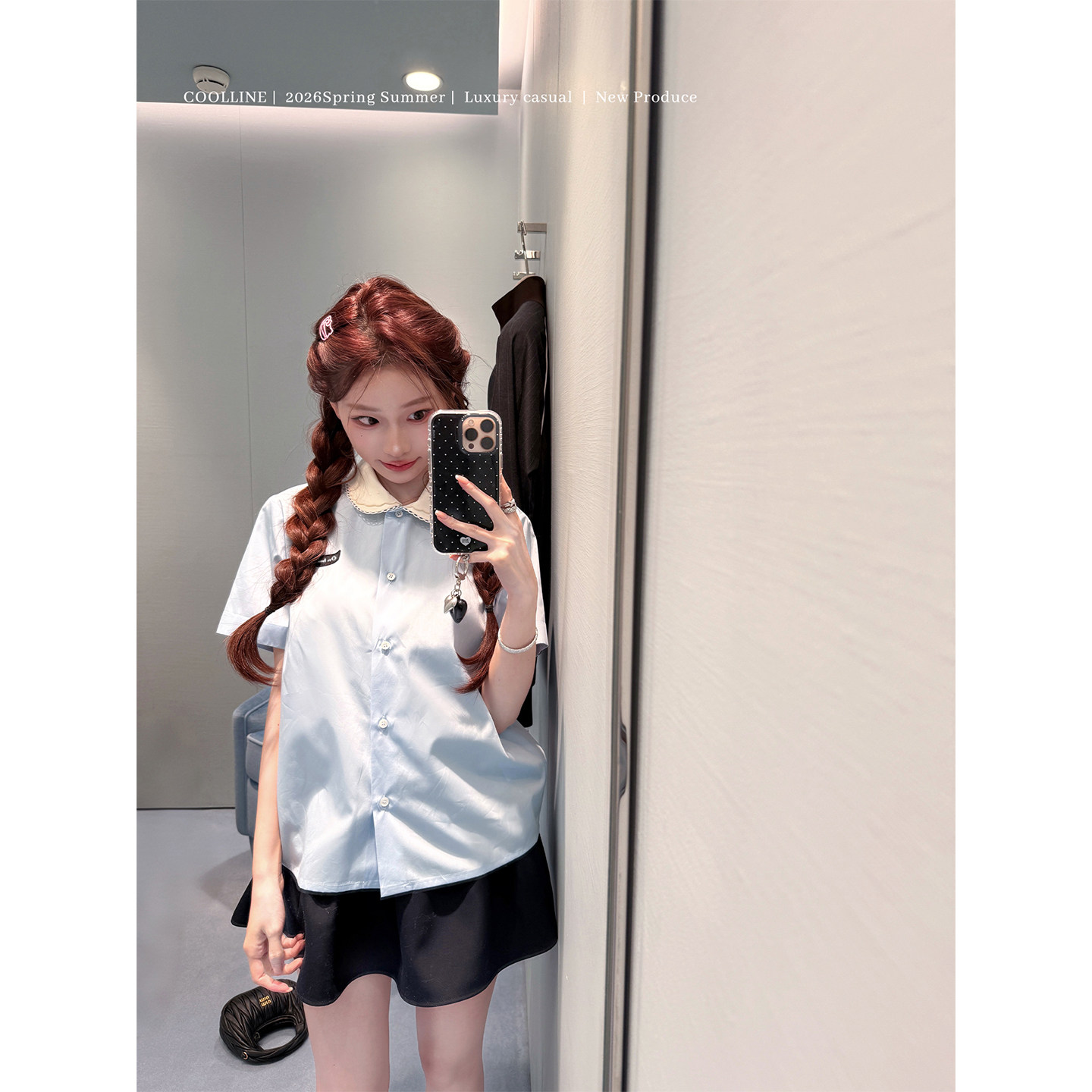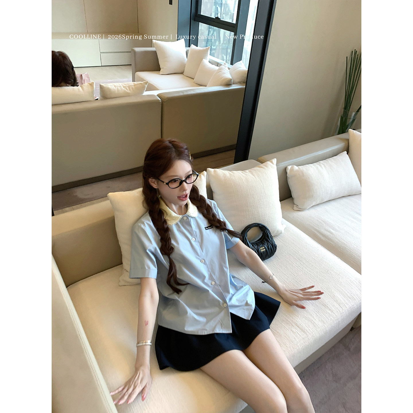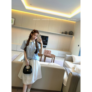 两色半身裙套装 COOLLINE林子熙 衬衫 26miu蓝色短袖 钟爱娃娃领