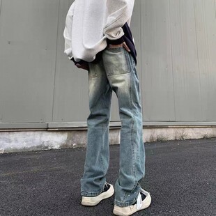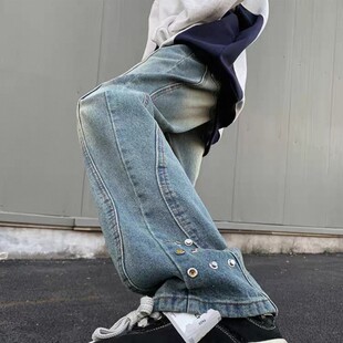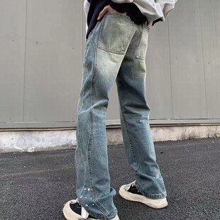 潮牌宽松拼接设计感做旧微喇长裤 26C8B2春季 高街牛仔裤 美式 子 新款