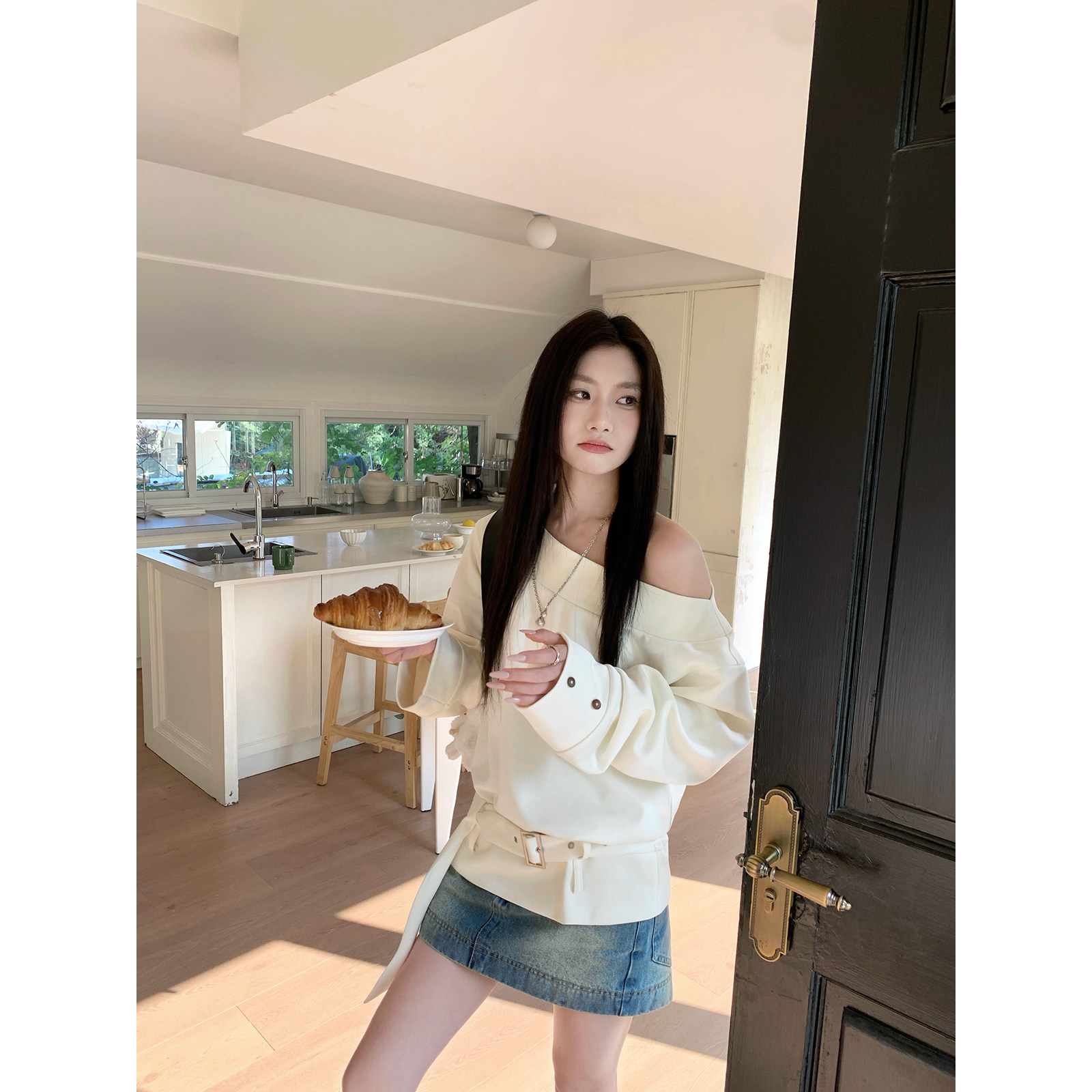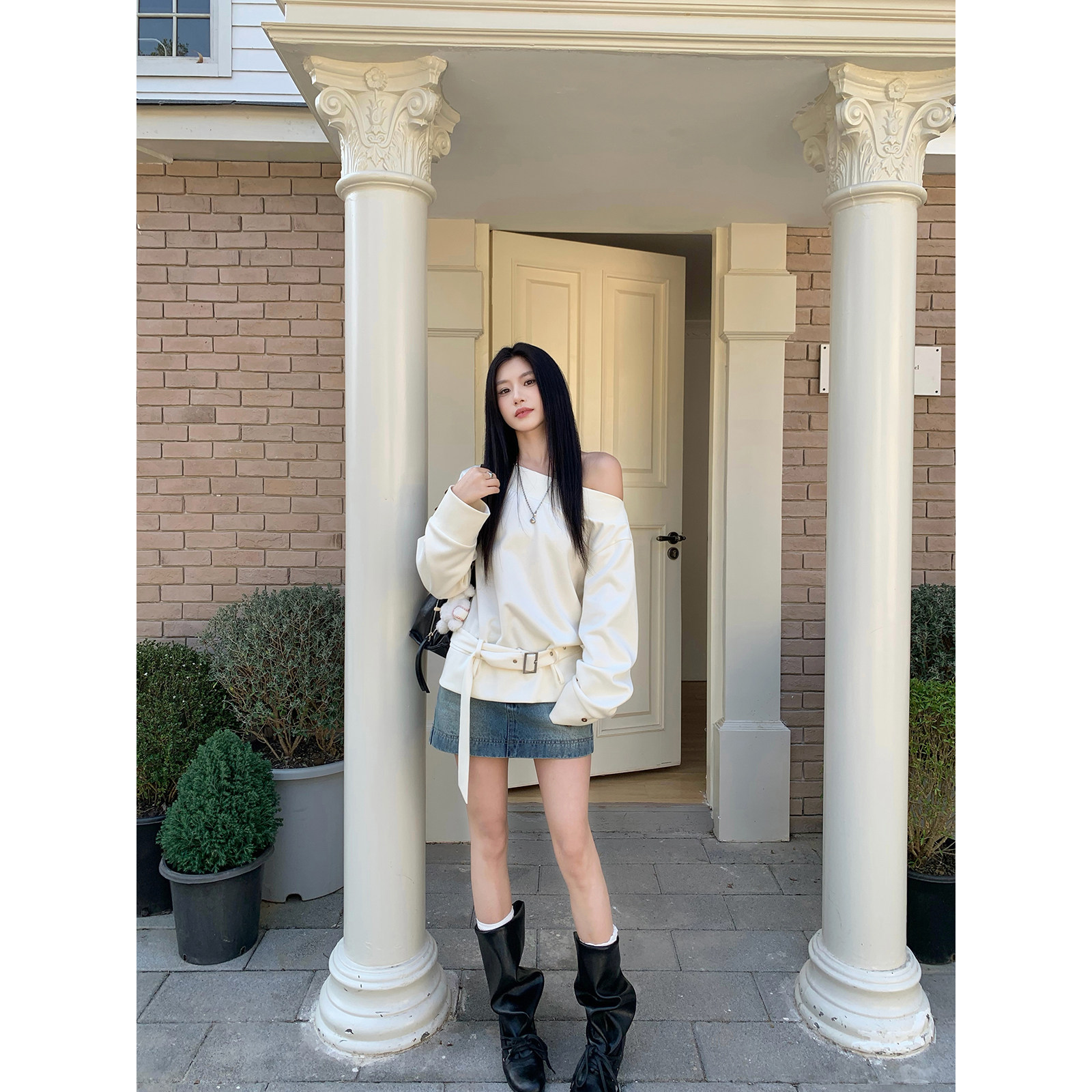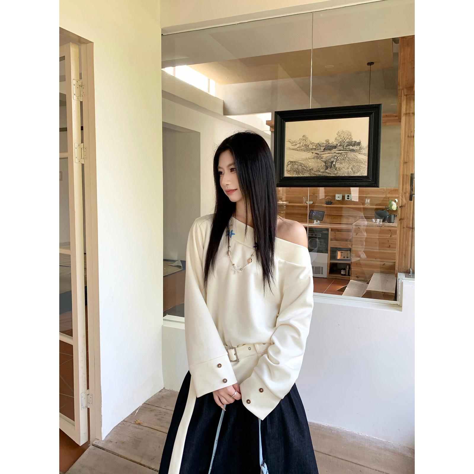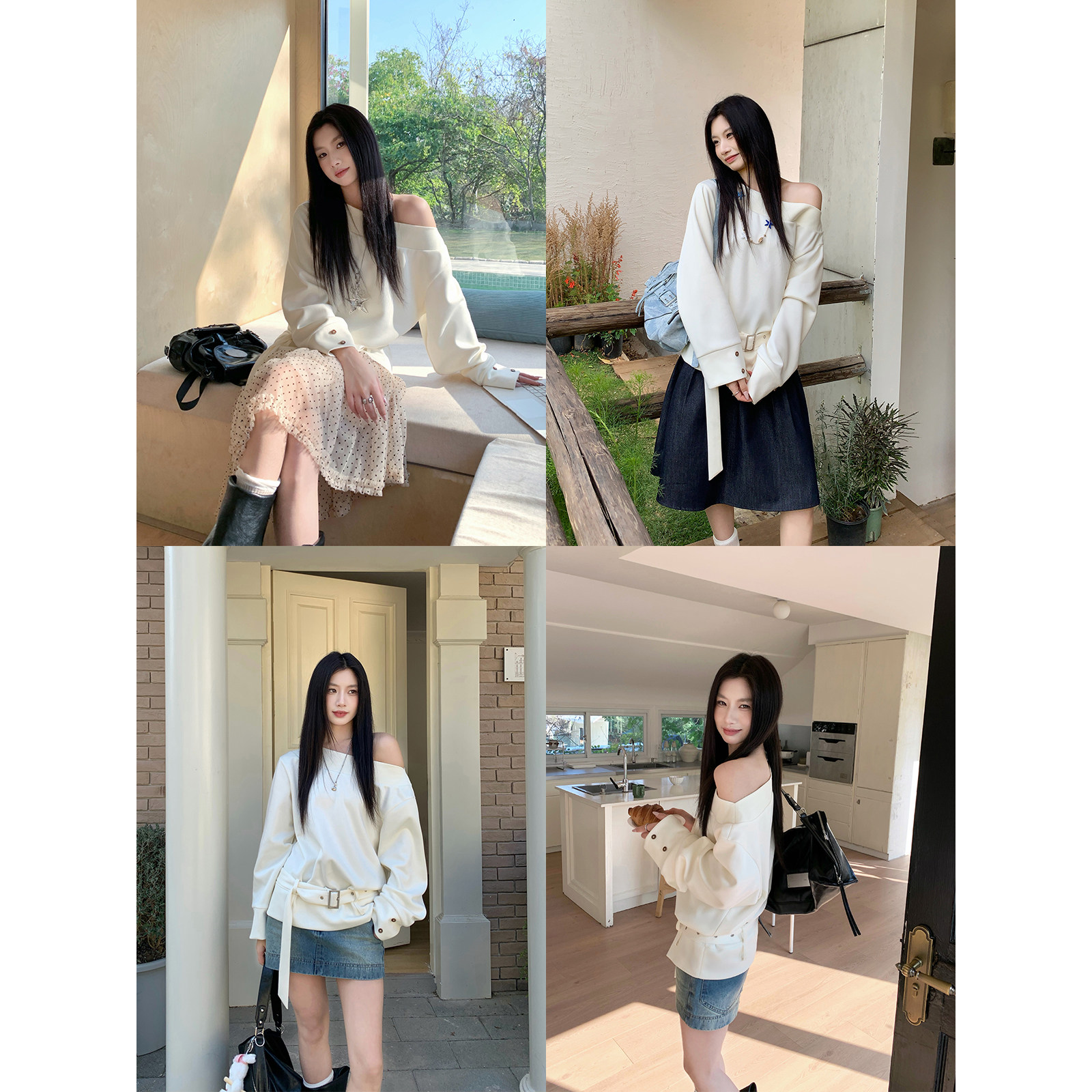 Joeyoo新款 宽松设计感米白色腰带斜肩卫衣女独特漂亮慵懒早春上衣