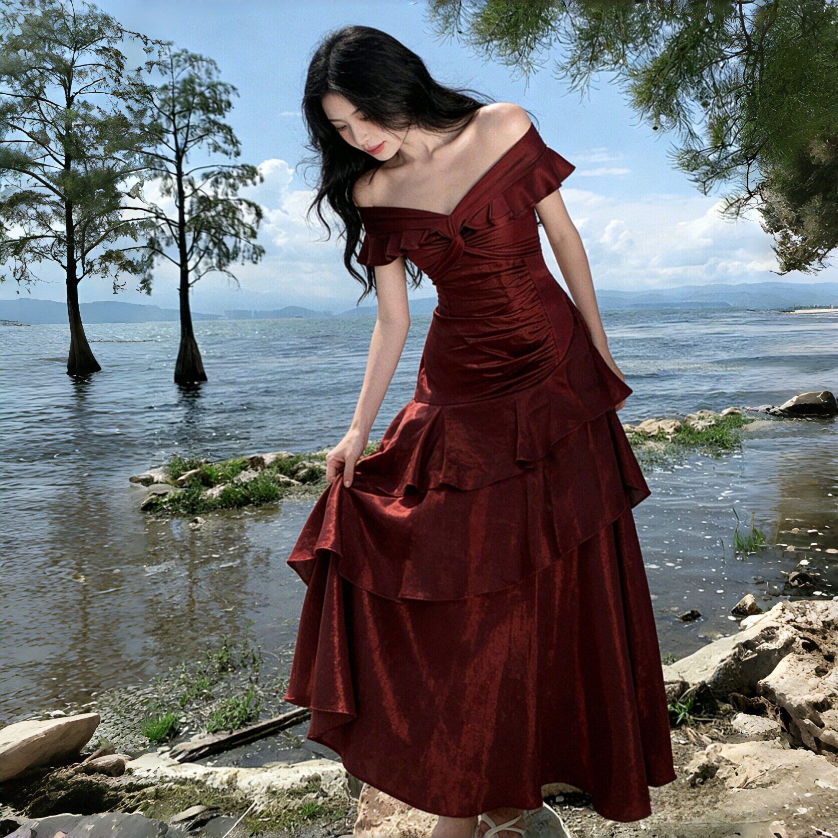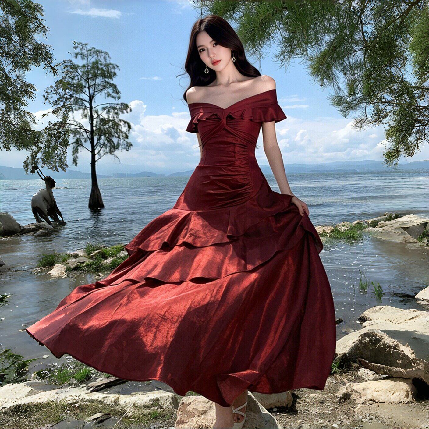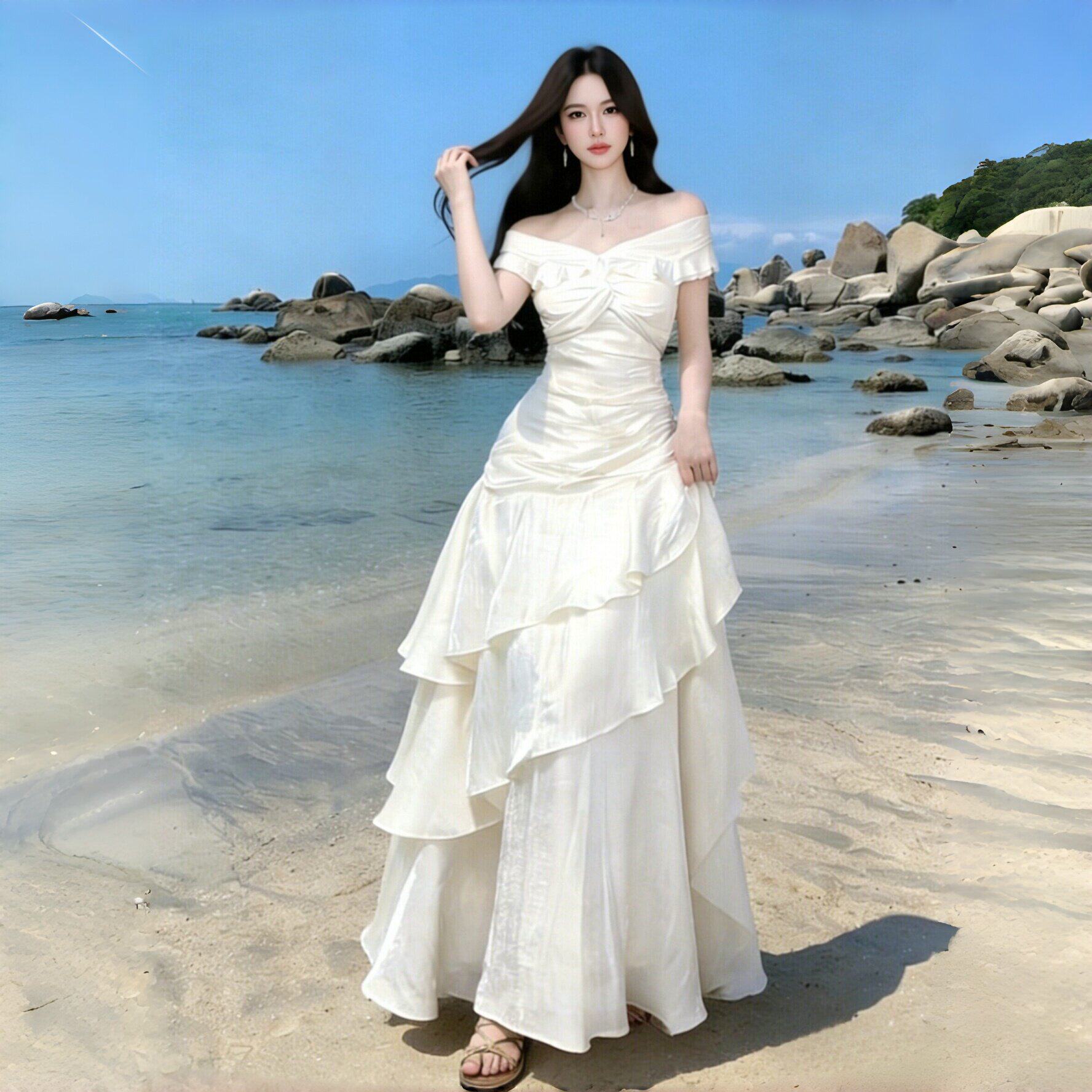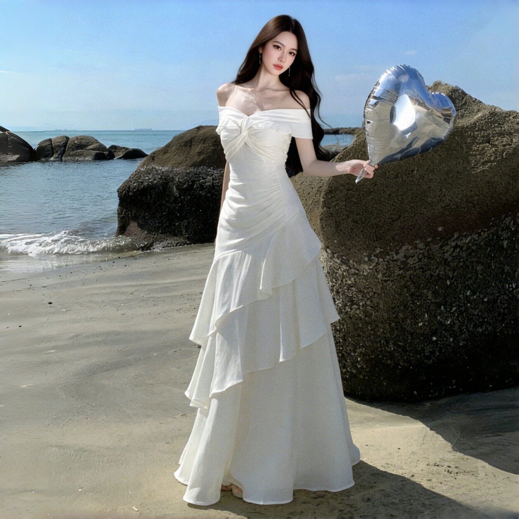 温柔风连衣裙法式 茶歇荷叶边一字肩蛋糕裙收腰长裙海边度假风女夏