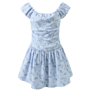 三彩独醒2026春季 一字领格纹碎花裙连衣裙小A字裙蓬蓬短裙F 新款