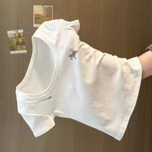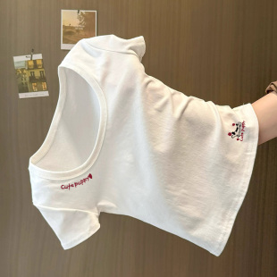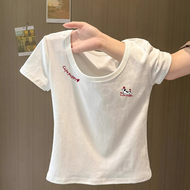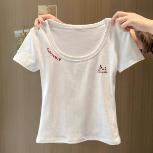 显瘦上衣 小个子收腰修身 甜辣妹白色简约印花U领正肩短袖 T恤女夏季