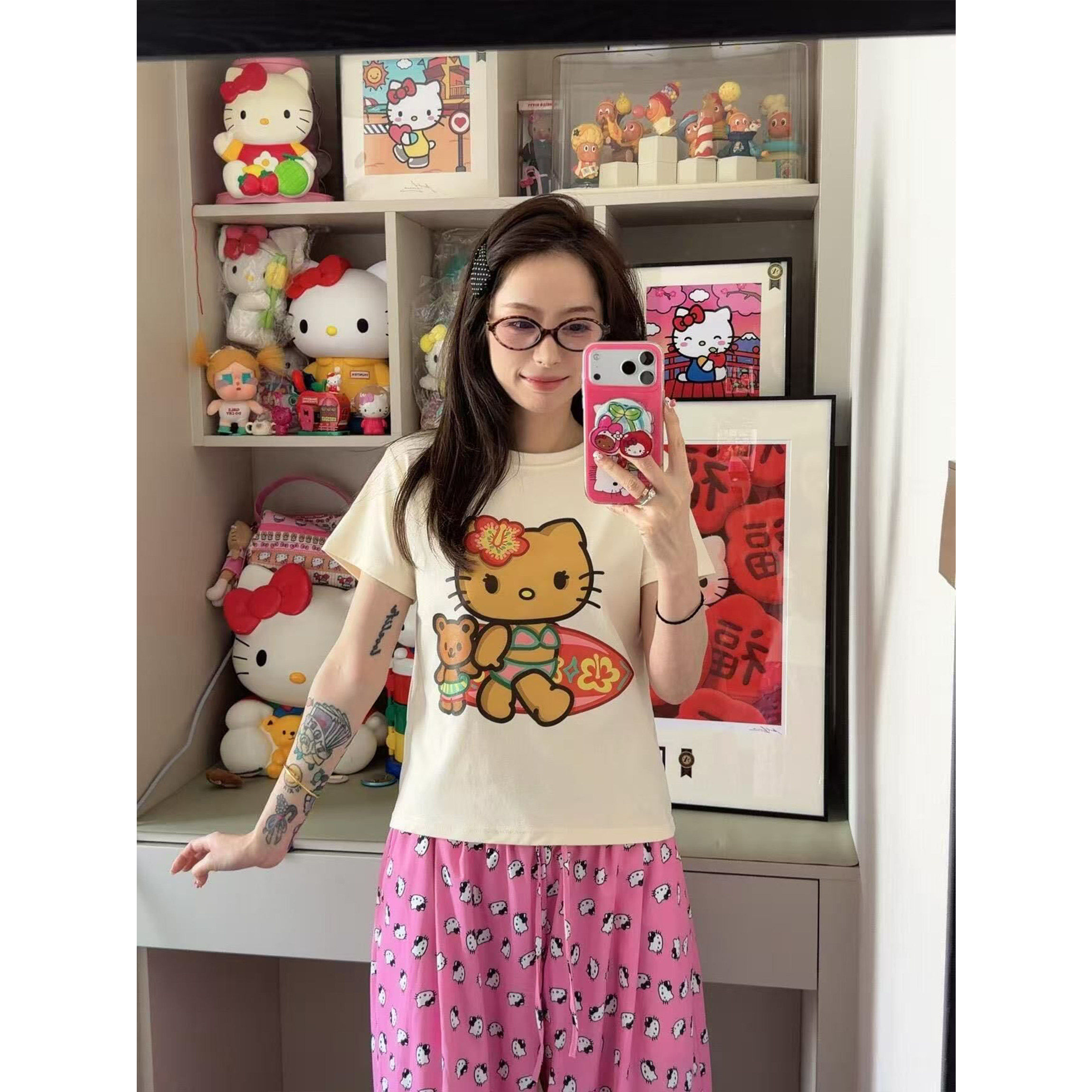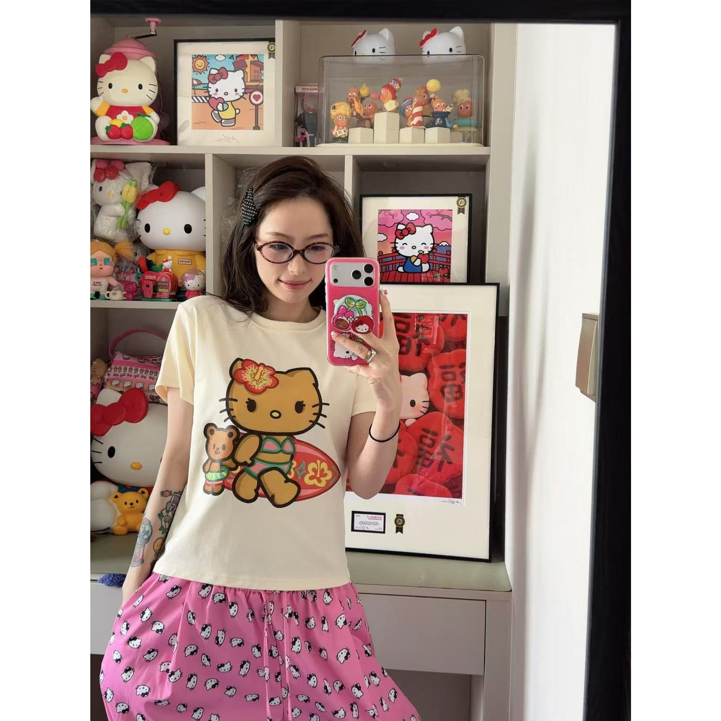 收腰短款 美式 修身 t恤女夏季 辣妹上衣 韩系卡通可爱凯蒂猫印花短袖