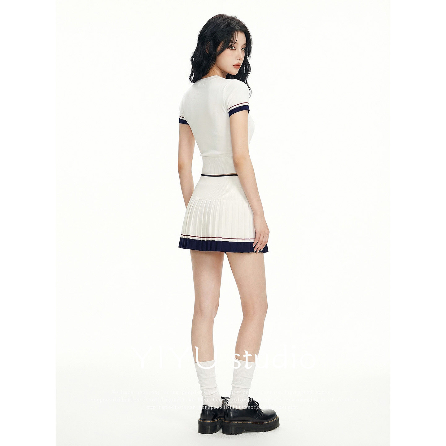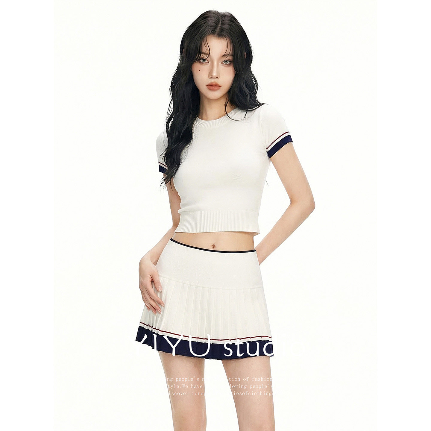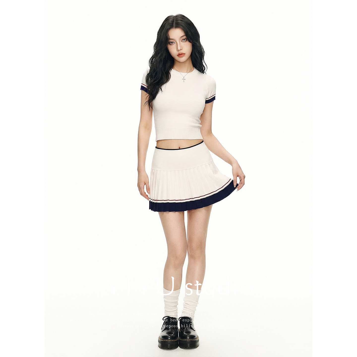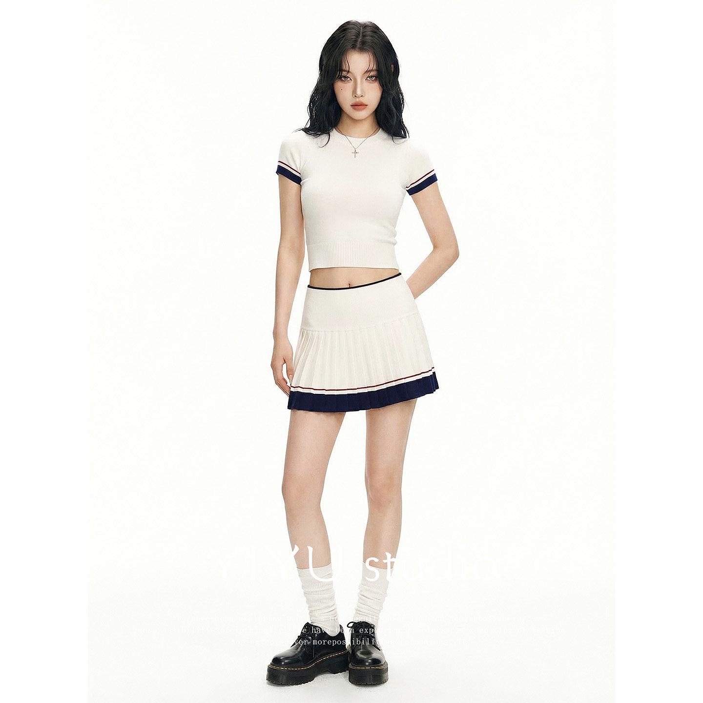 伊予YiYu 女修身 美式 t恤半身短裙套装 两件套 复古白色针织短袖