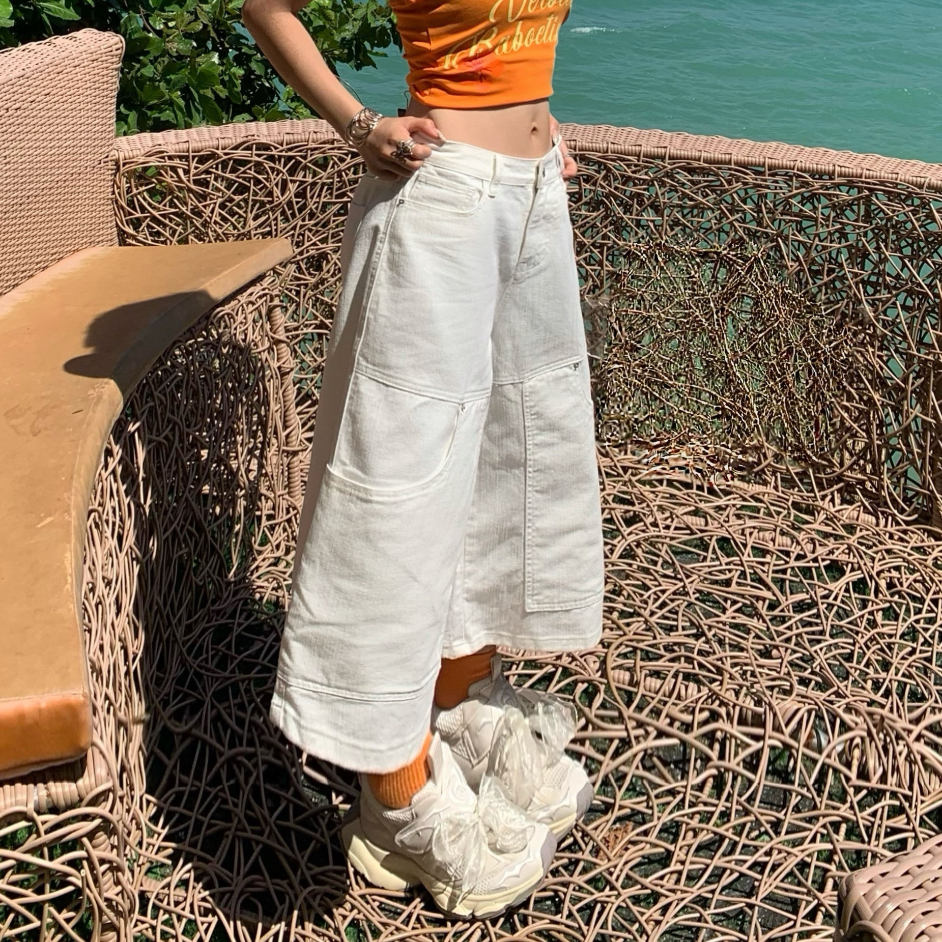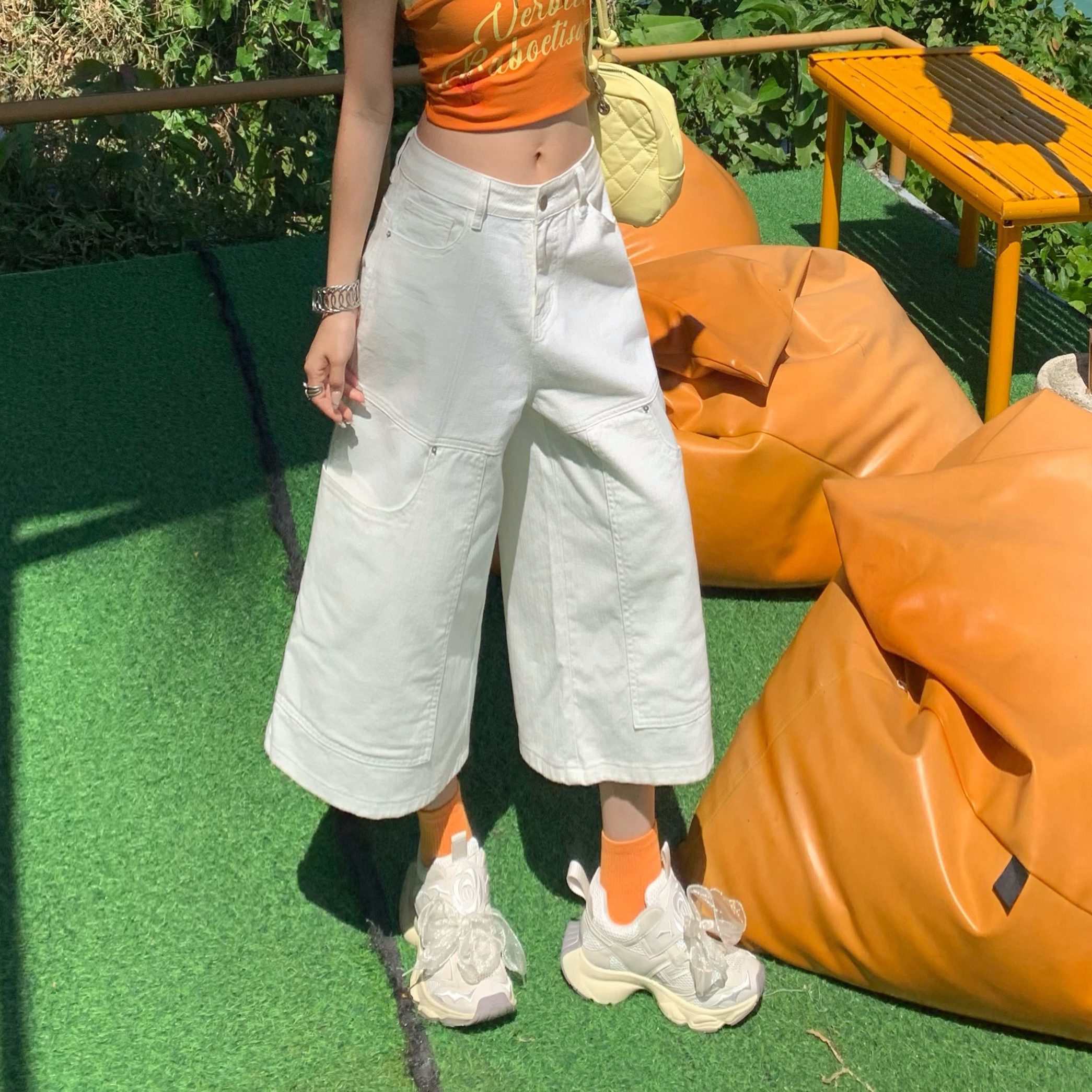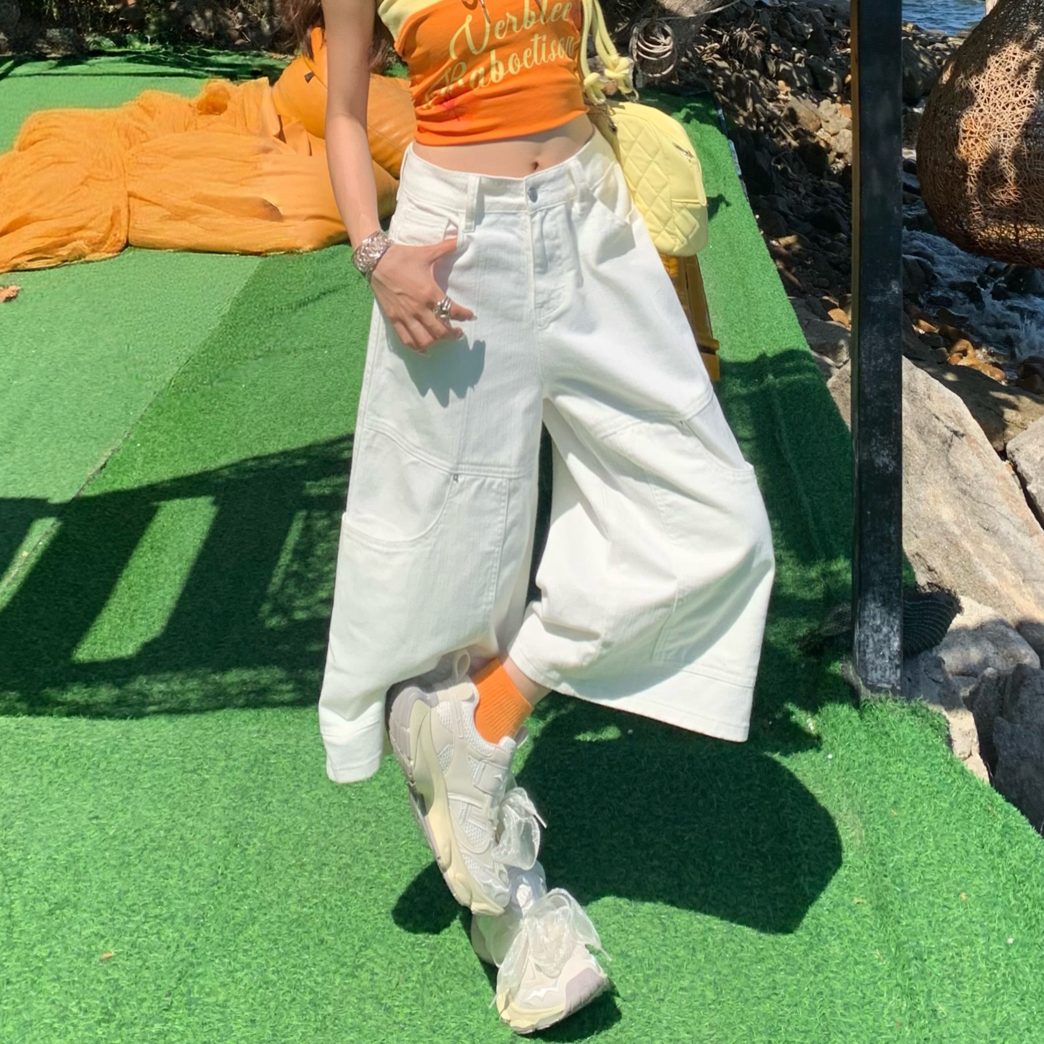 显瘦垂感多袋七分裤 牛仔小众夏季 女 白色百搭拼接阔腿港式 2026新款