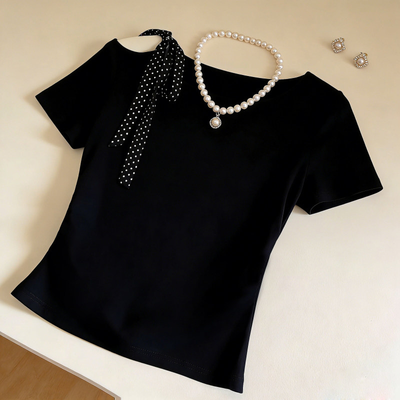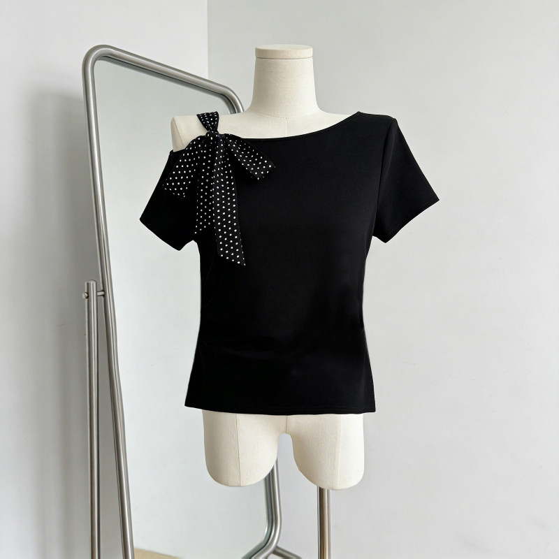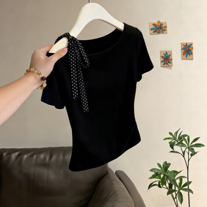 洋气上衣 小个子时尚 设计感小众波点蝴蝶结绑带正肩短袖 T恤女夏季