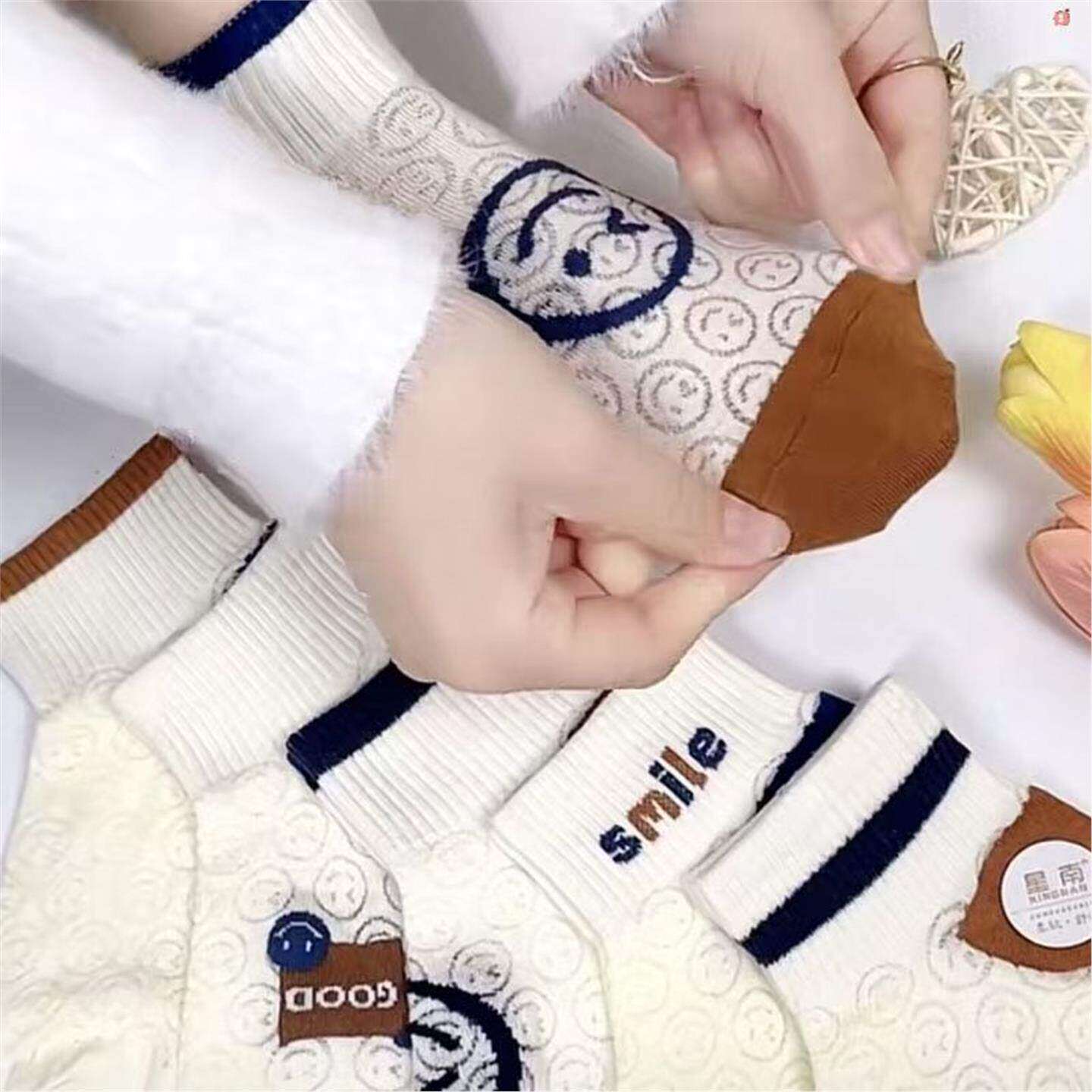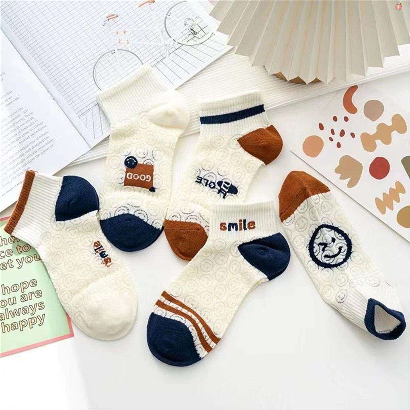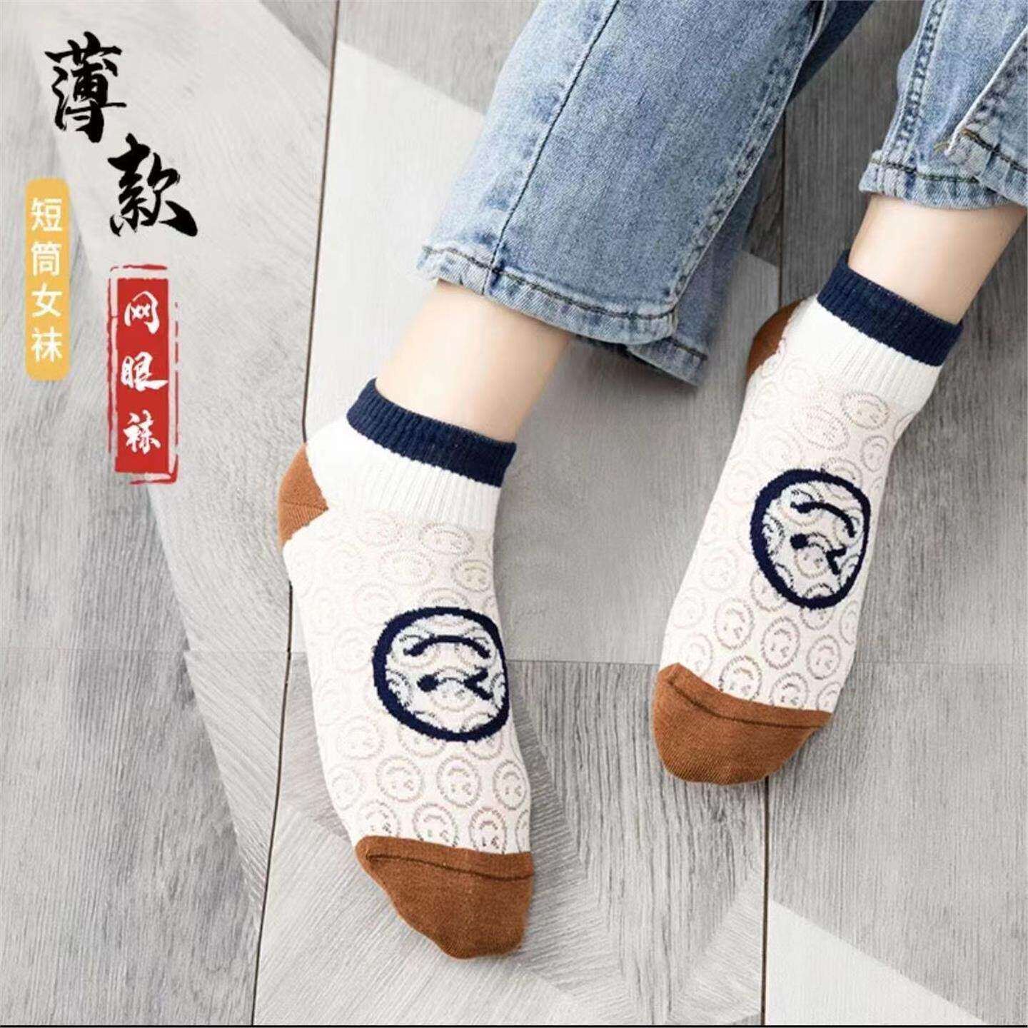 5双夏日笑脸浮雕卡丝镂空网眼女薄款 透气潮流ins百搭短筒袜