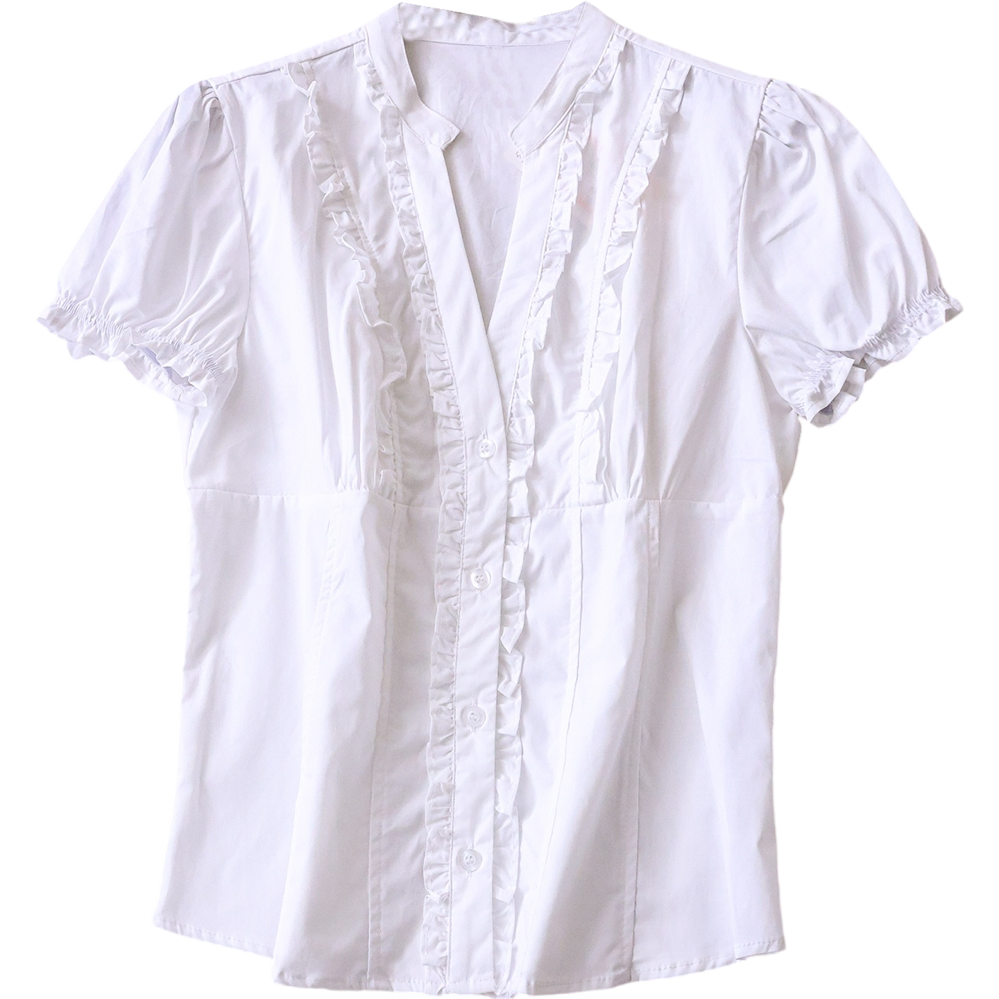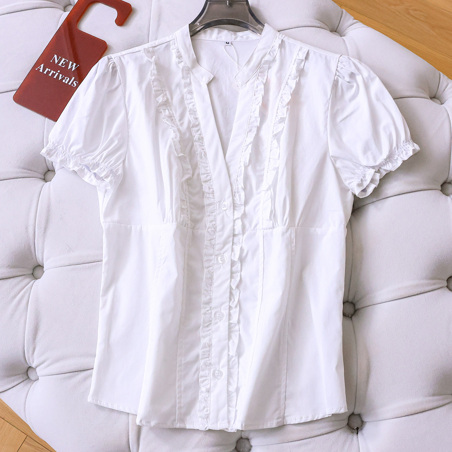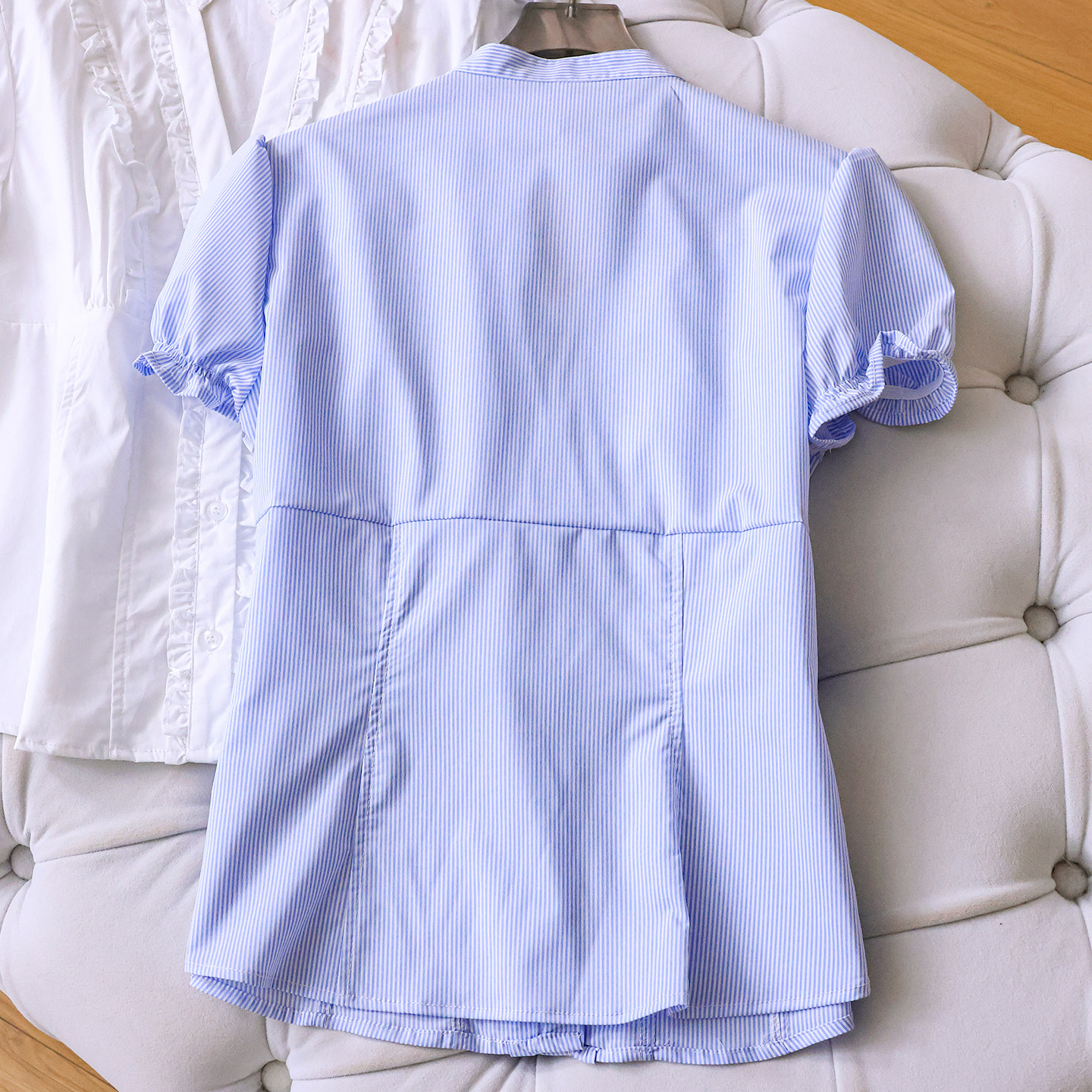 减龄女衬衫 泡泡短袖 W789 2026夏新款 蓝色条纹木耳花边V领显瘦修身