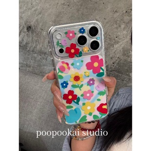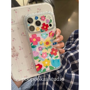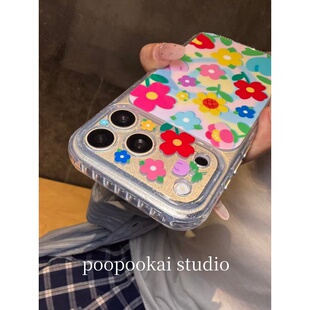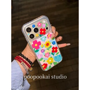 14全包防摔13保护套 iPhone15pro手机壳女款 PooPookai春日小清新爱心花朵适用于苹果16 17promax