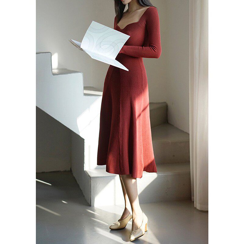 修身 复古大方领收腰鱼尾裙 针织打底A字连衣裙女秋 法式 Chings