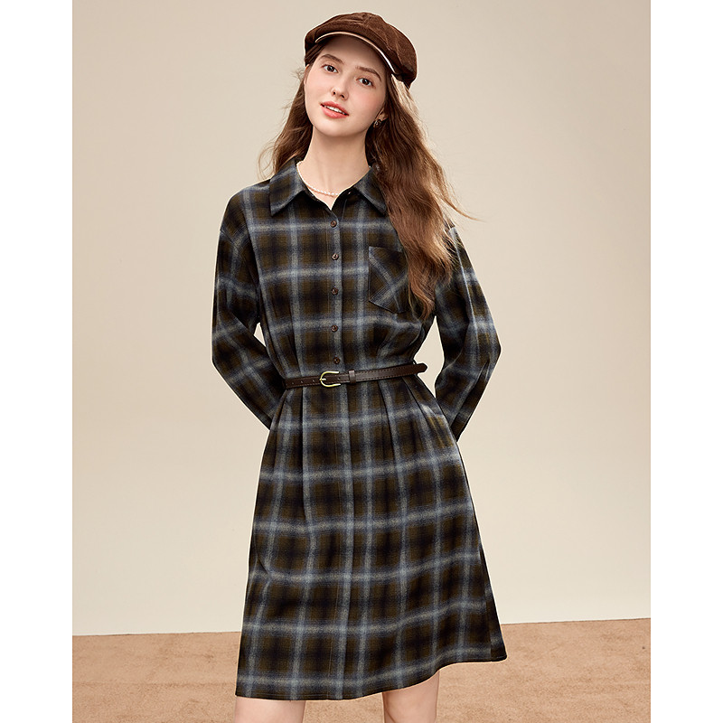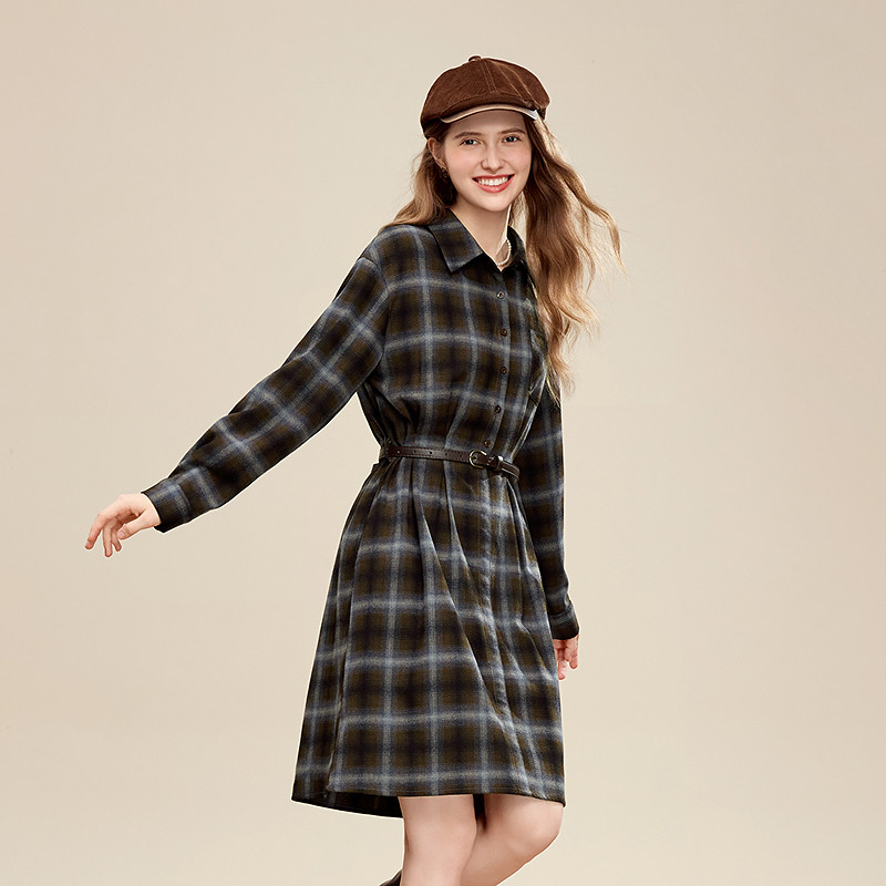 新款 连衣裙2025年冬季 配腰带中长裙 纹衬衫 betu百图复古英伦风格
