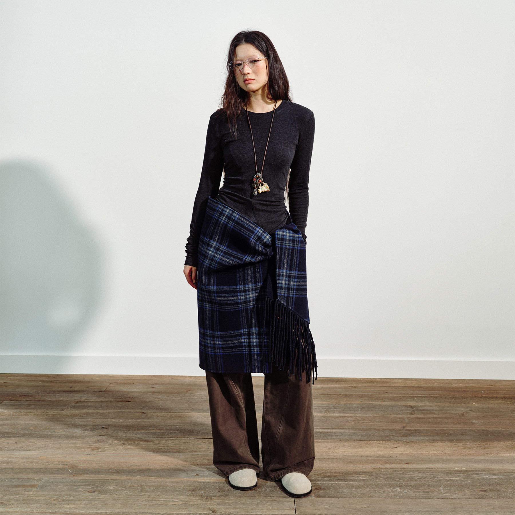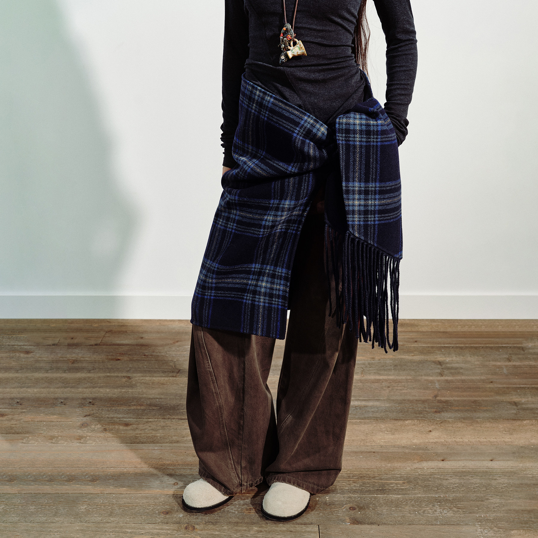 VERMO 羊毛格纹手工缝制双面呢流苏围巾围裹半裙 多种穿法