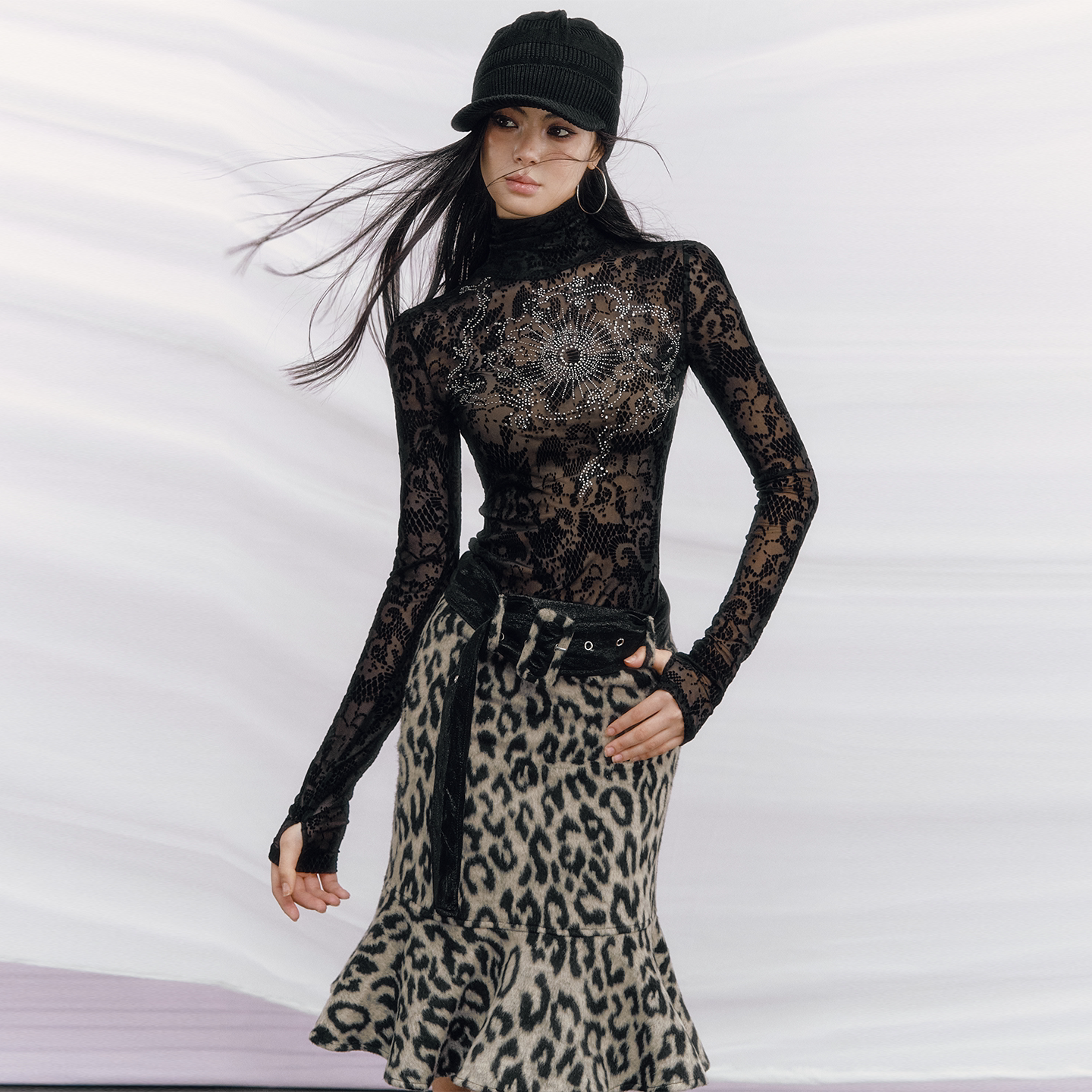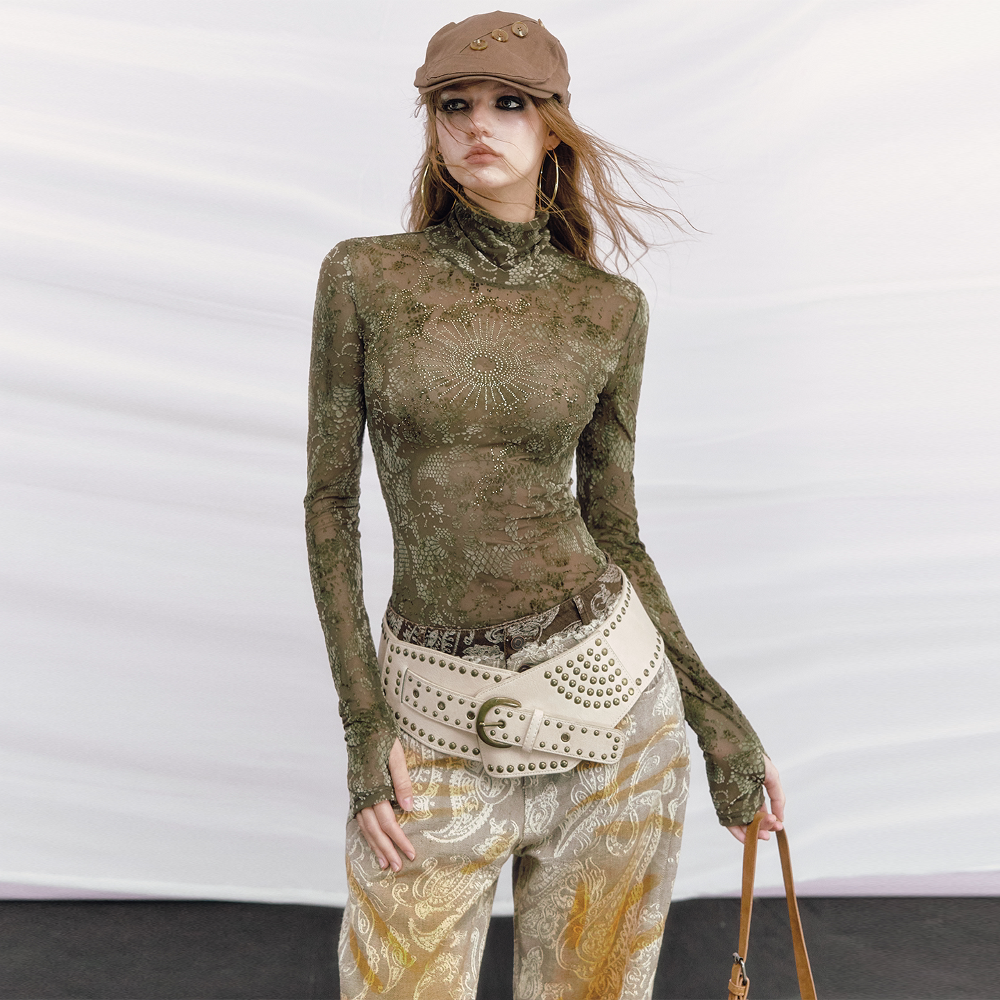 辣妹原创烫钻丝绒提花高领长袖 曼陀罗 OfAkiva T恤 李梦同款