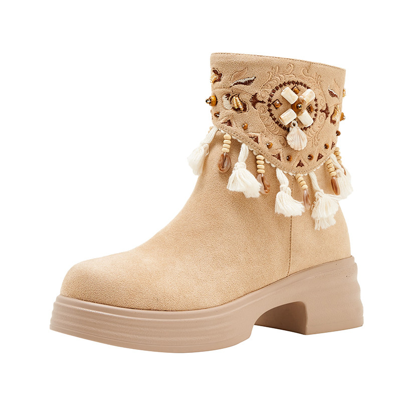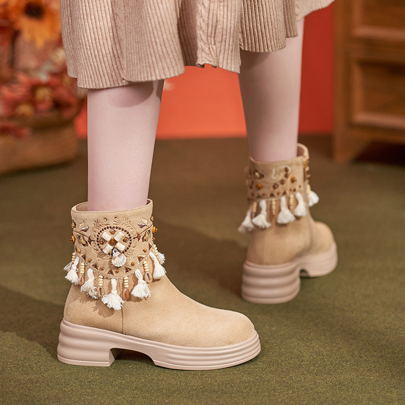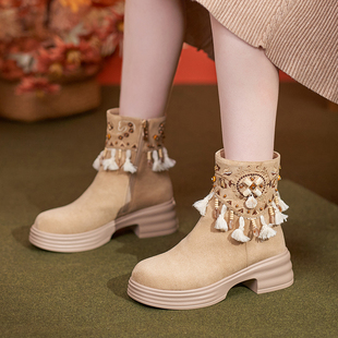 2025秋冬新款 美拉德风短靴复古马丁靴子女民族风流苏靴厚底松糕底