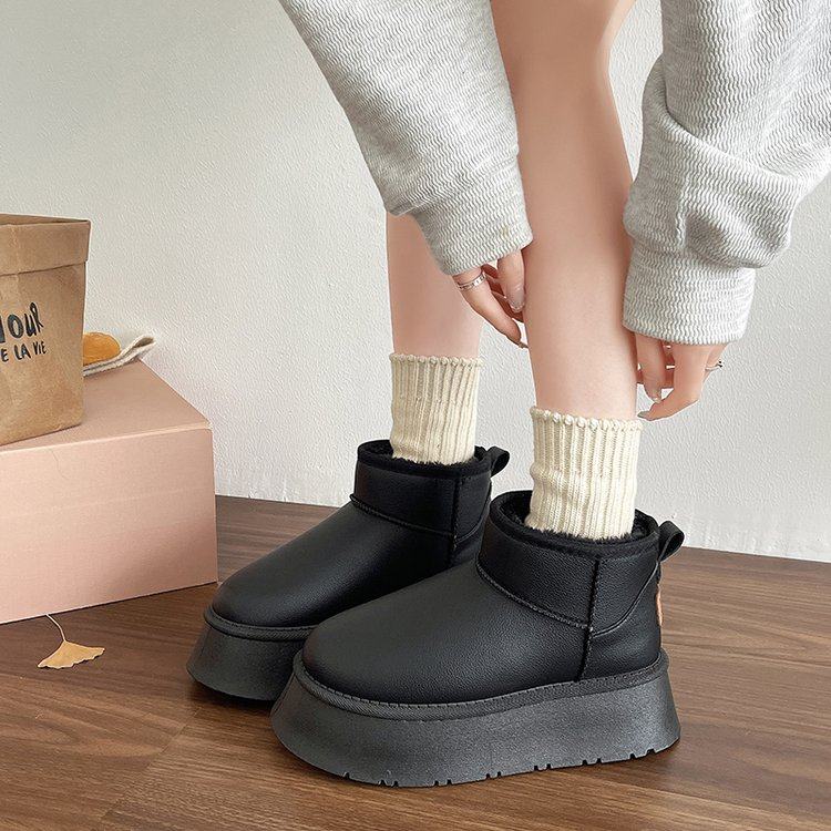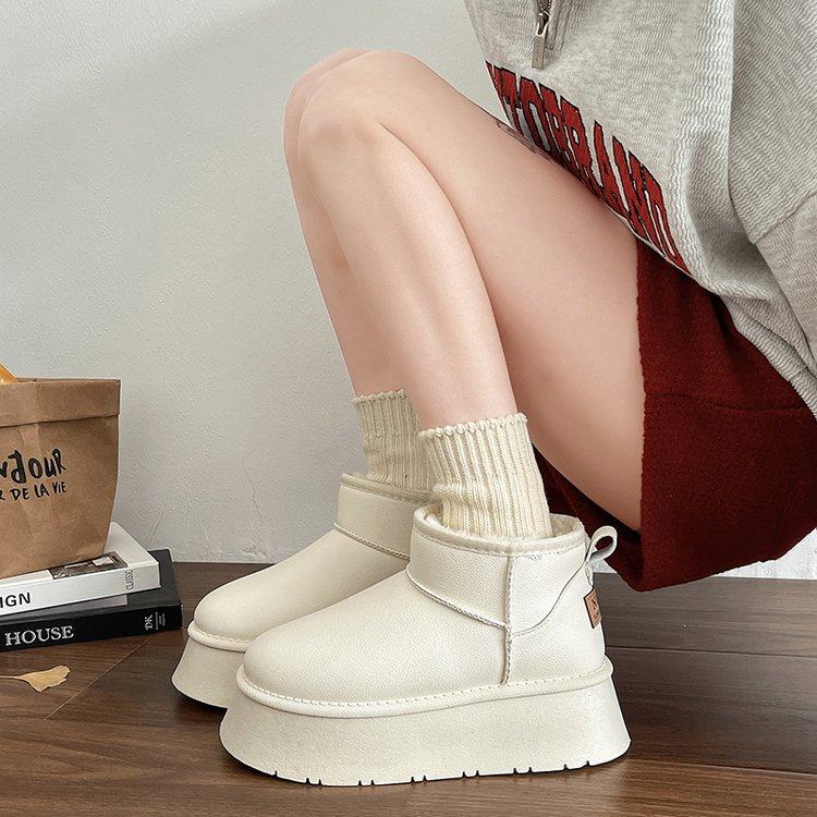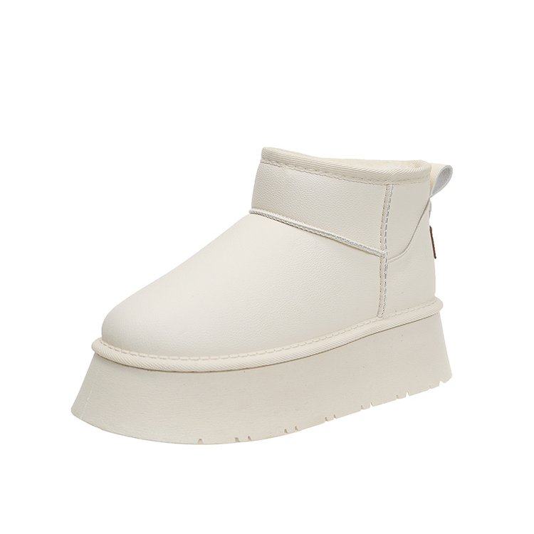 加绒加厚舒适保暖皮面防水棉鞋 厚底增高白色雪地靴女2025新款 冬季