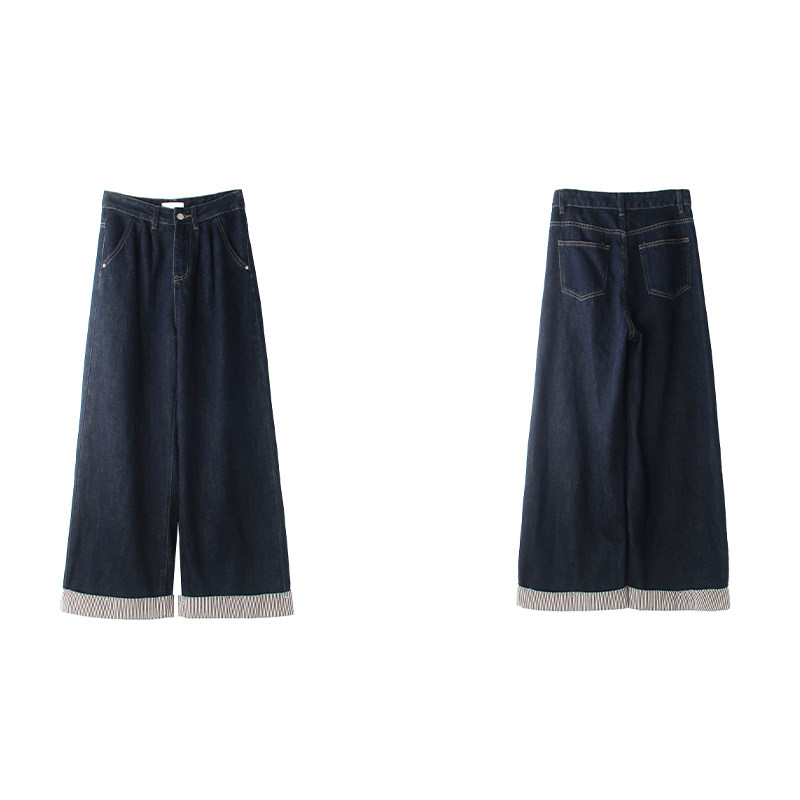 小个子显高宽松拖地直筒裤 加绒加厚新款 子 女冬季 深蓝色阔腿牛仔裤