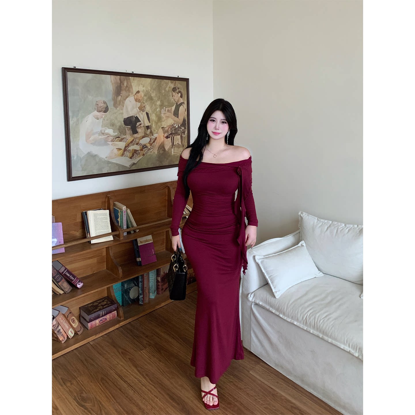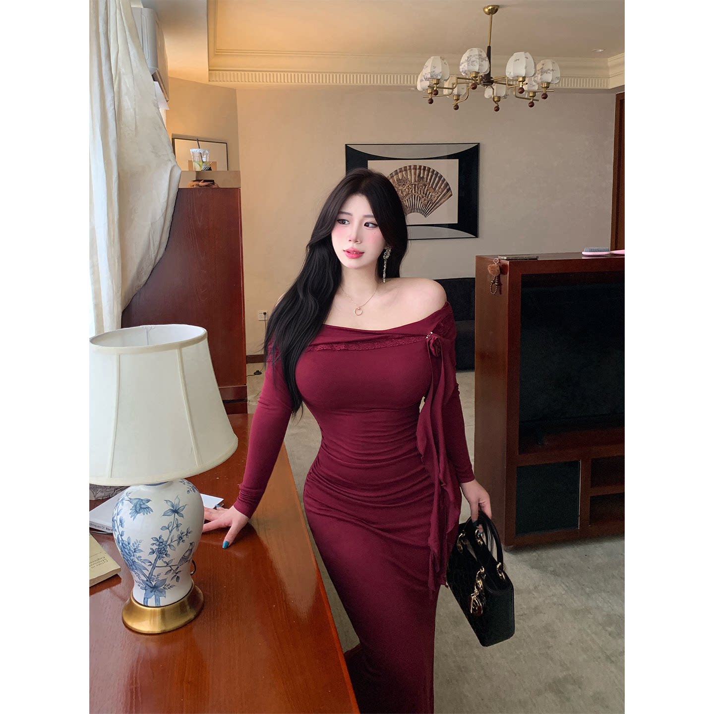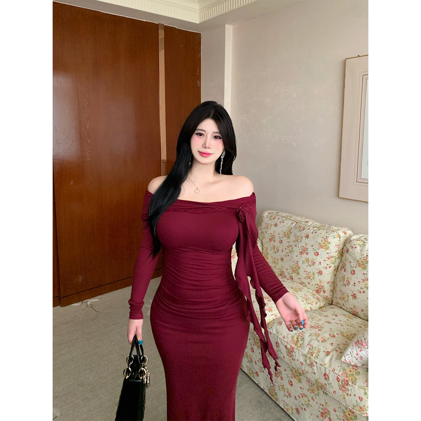 连衣裙气质显白长裙微胖修身 斜肩长袖 酒渍玫瑰 包臀裙 babes