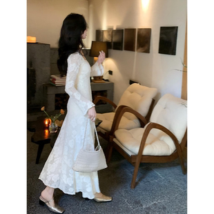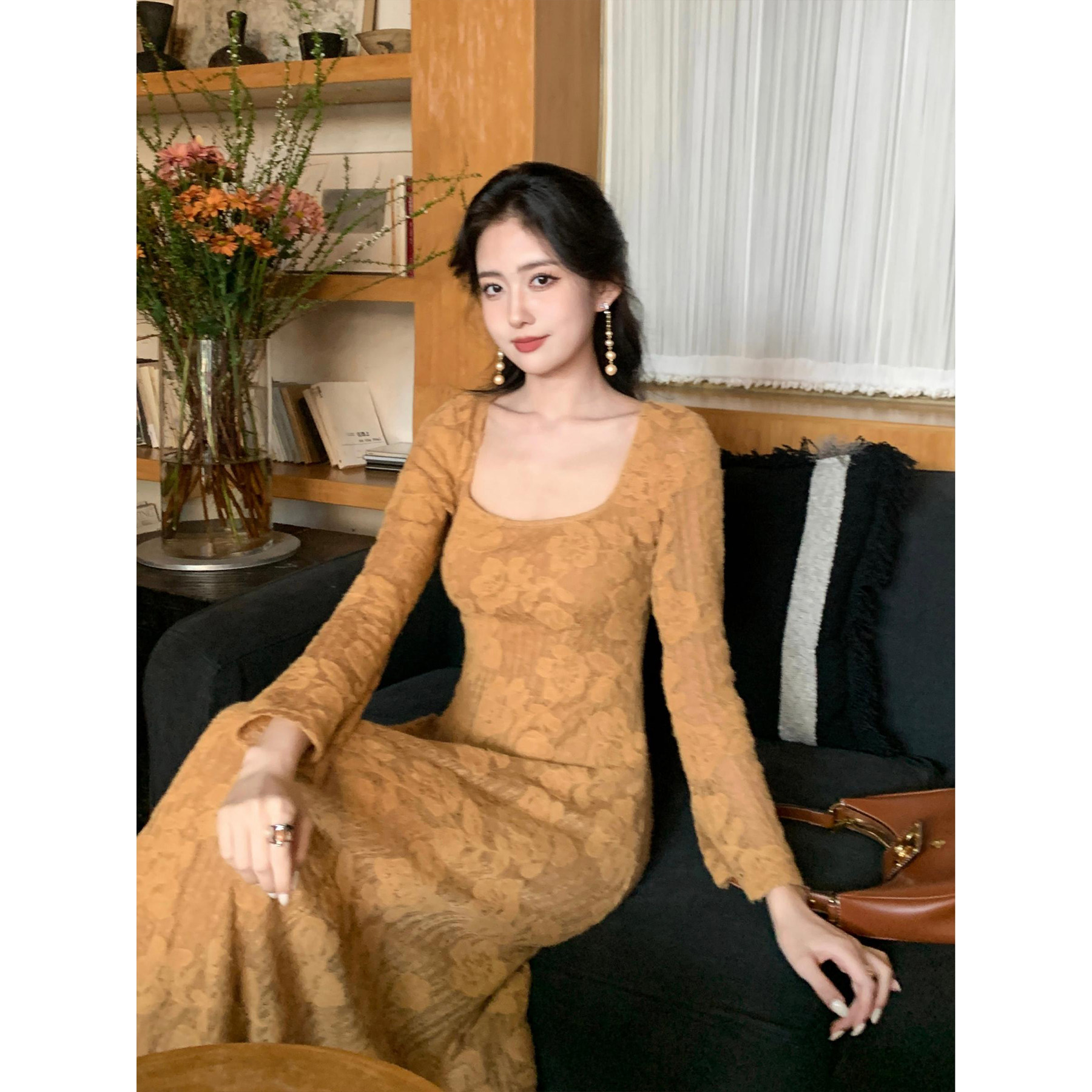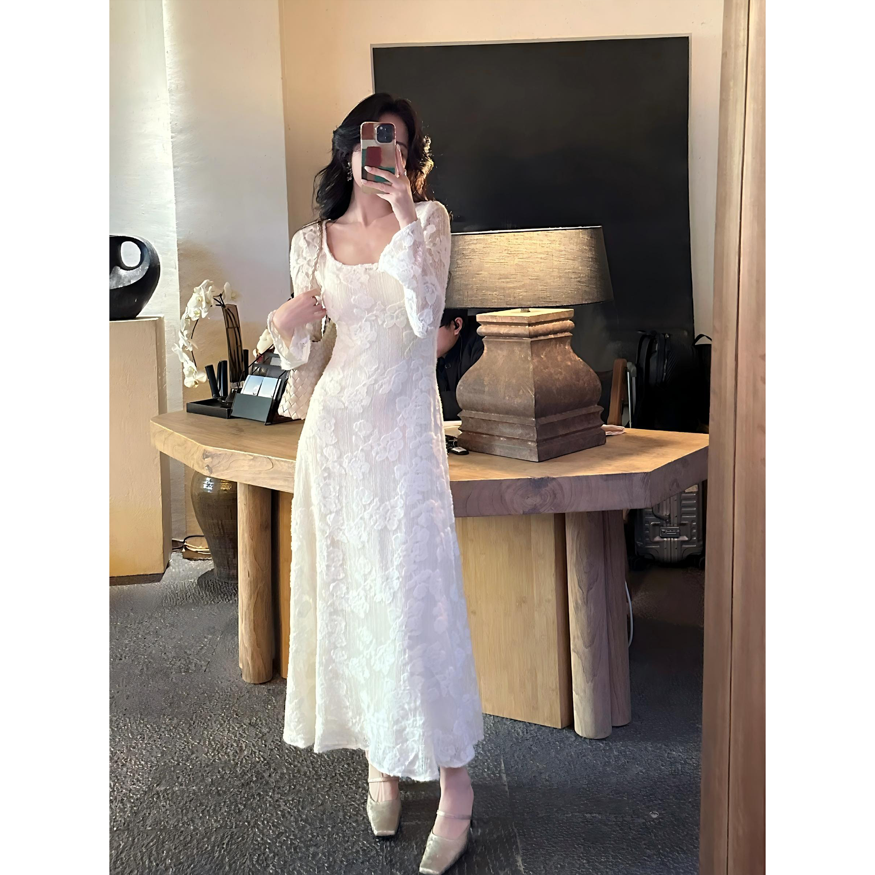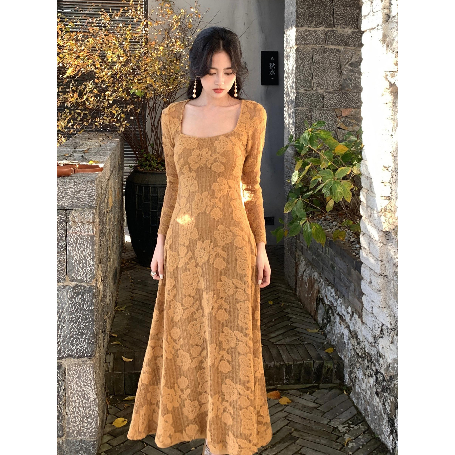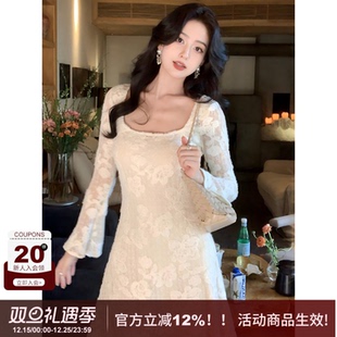 显瘦百搭A字长款 优雅气质感蕾丝花朵修身 连衣裙 方领法式 SYT自制