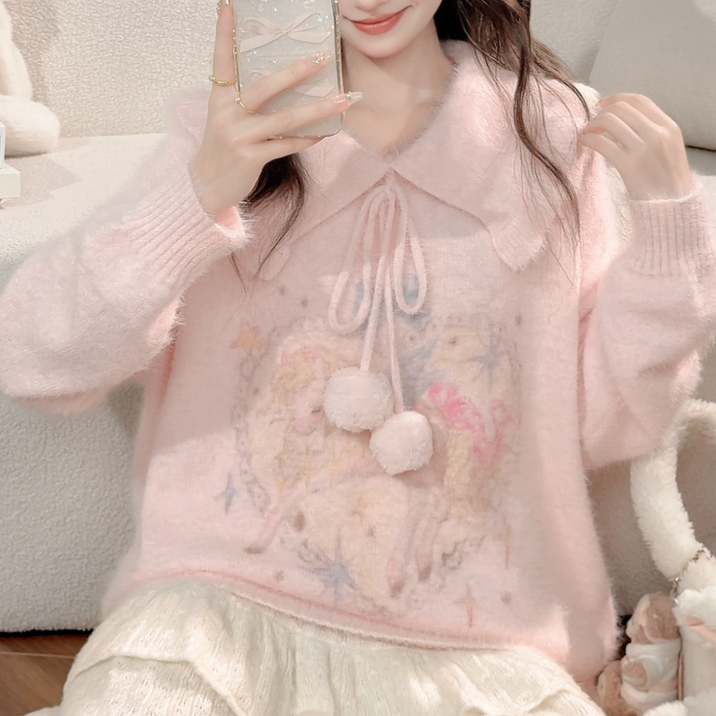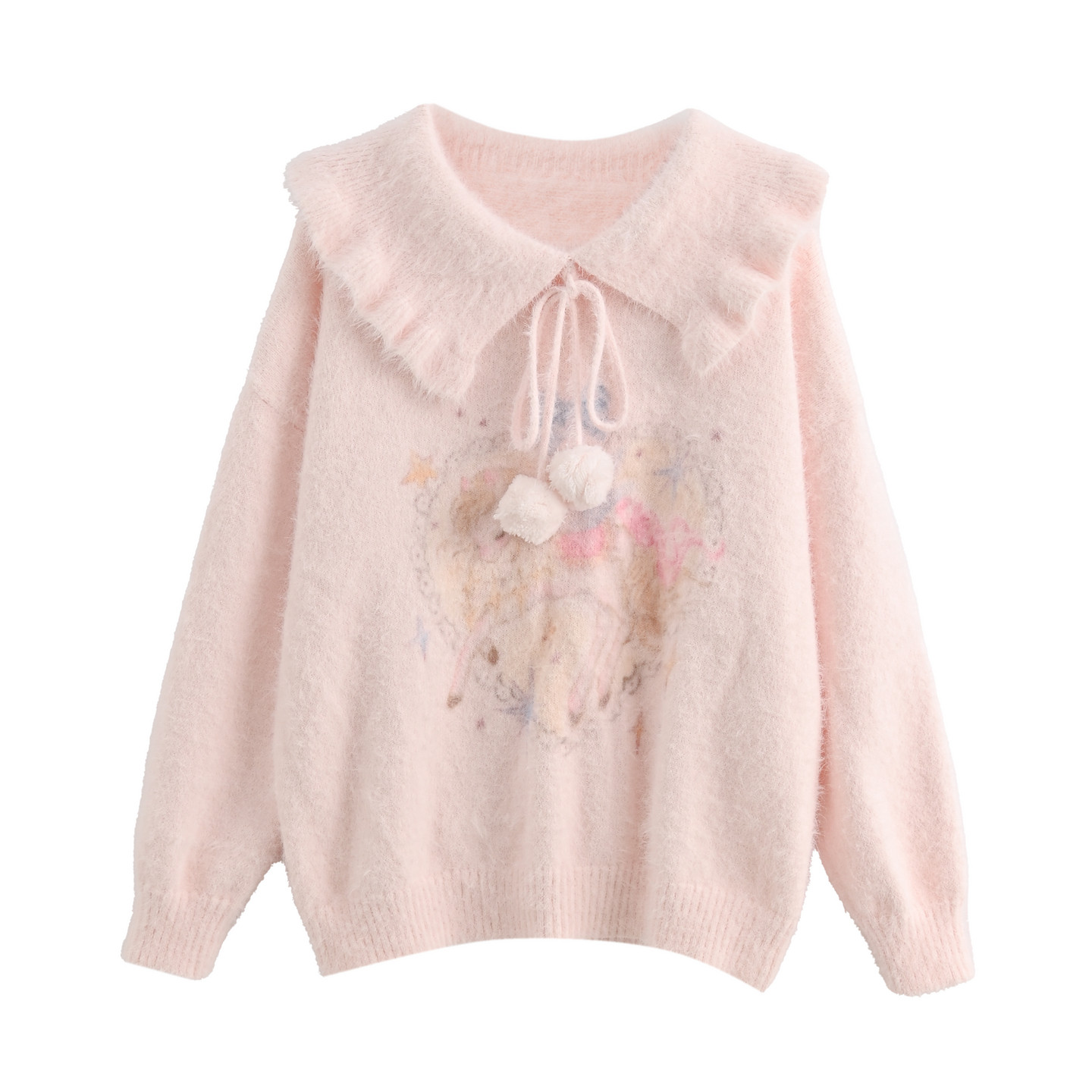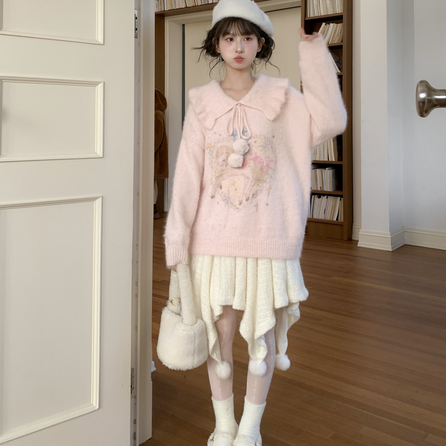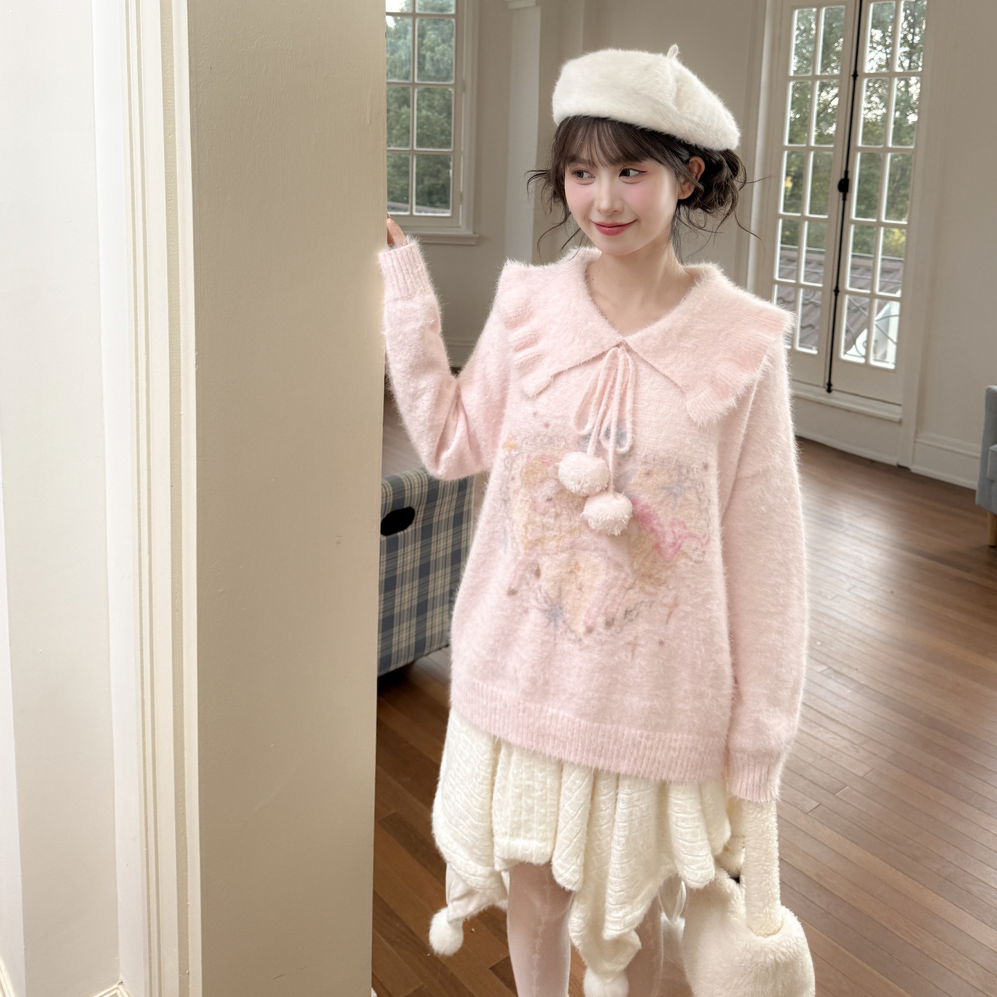 森女部落甜美风卡通提花套头毛衣女polo领宽松百搭保暖针织衫 冬季