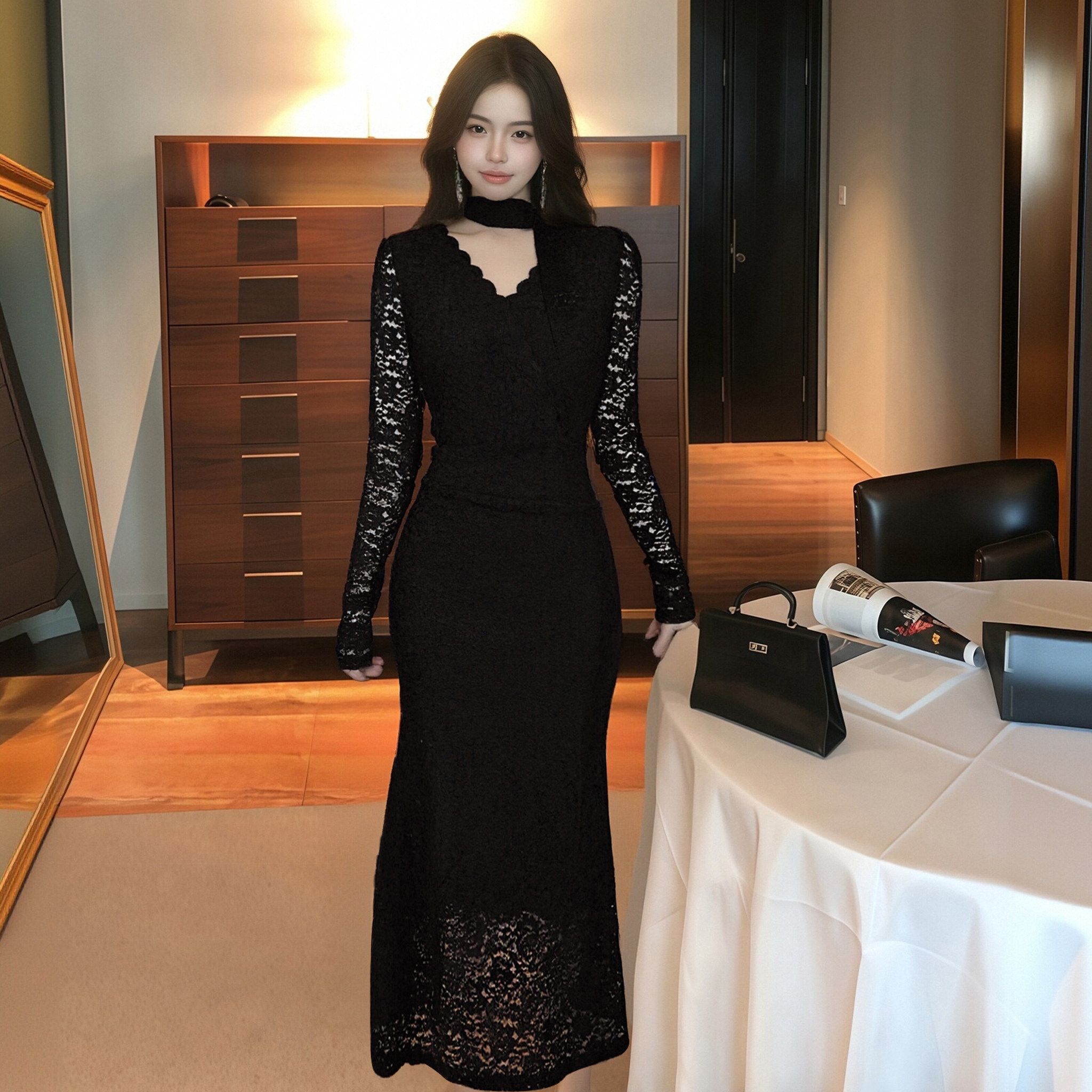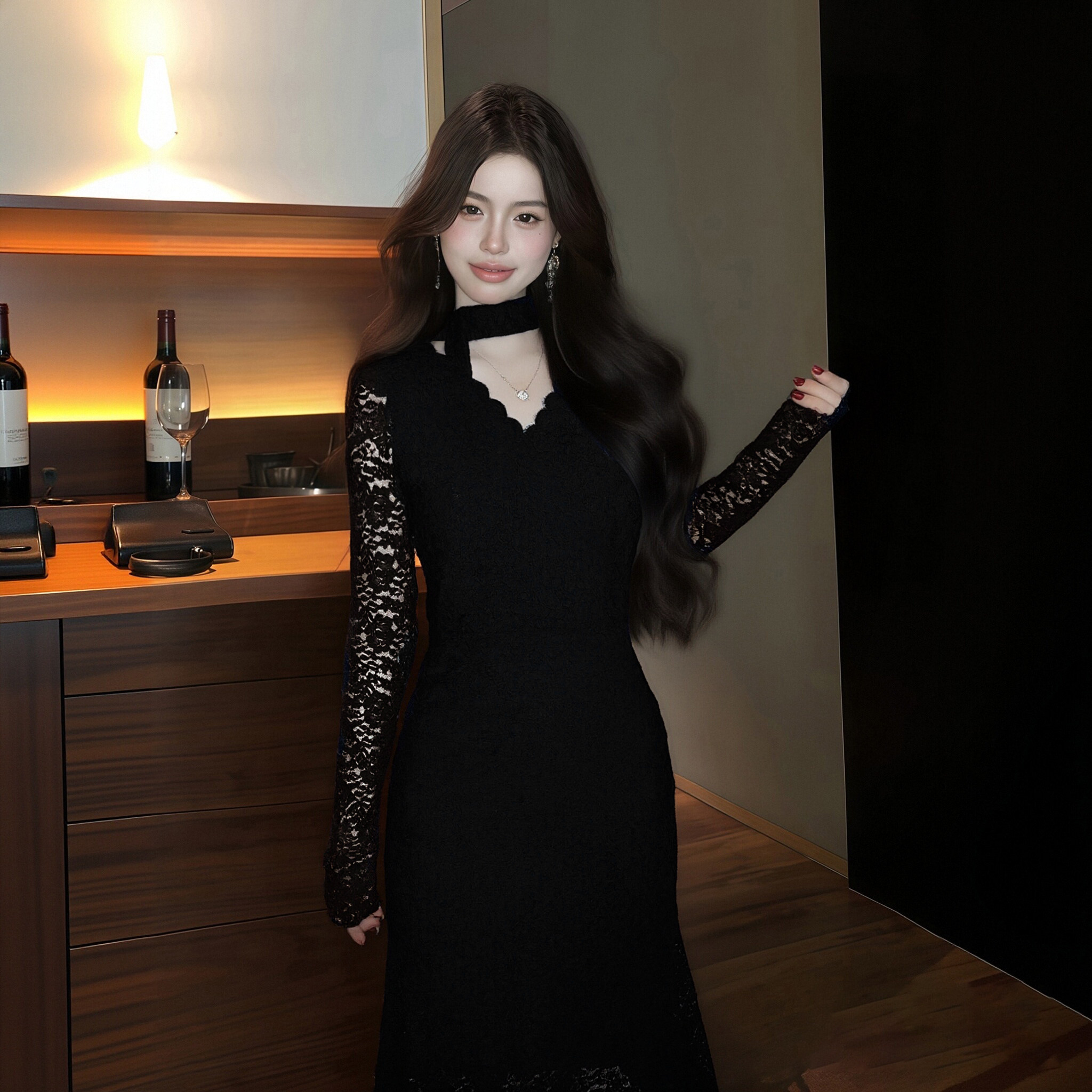 加绒加厚蕾丝镂空V领连衣裙2025秋冬新款 裙子DM0222A 显瘦修身