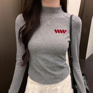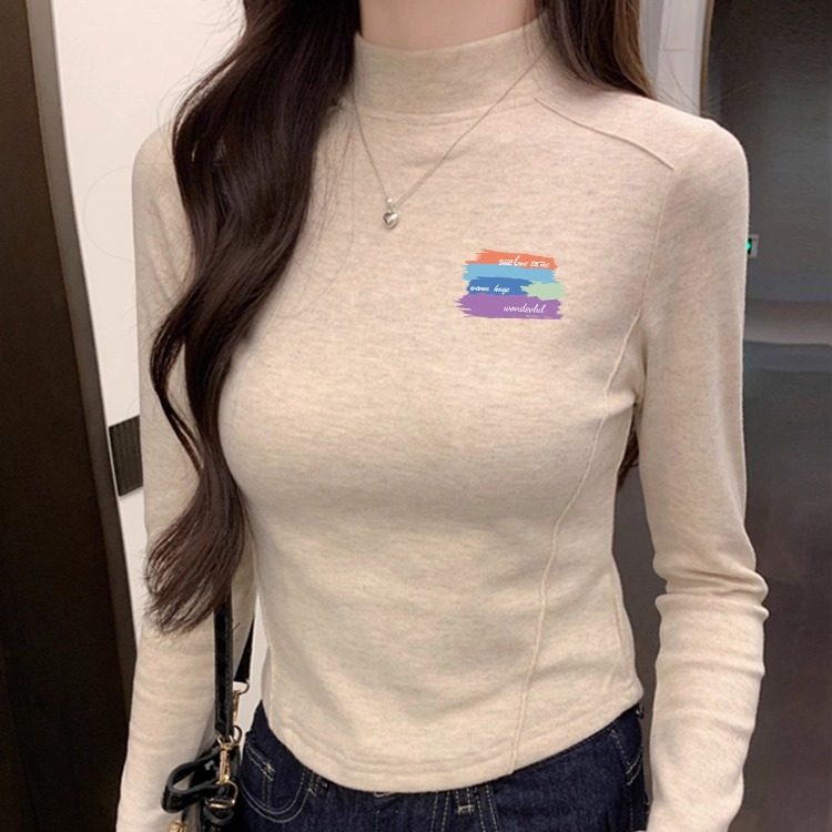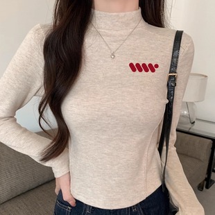 显瘦磨毛保暖鱼骨弧形下摆上衣 修身 燕麦色半高领长袖 T恤女秋冬季