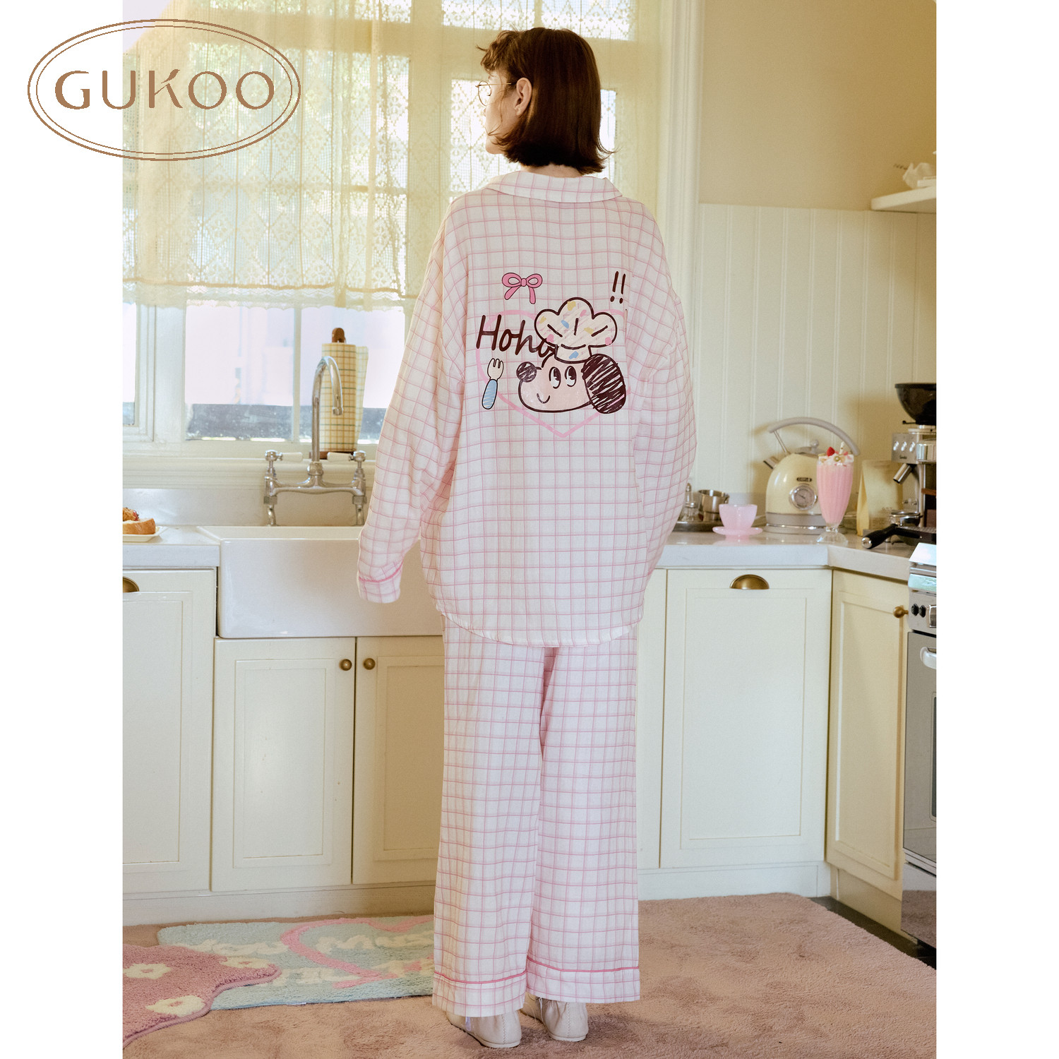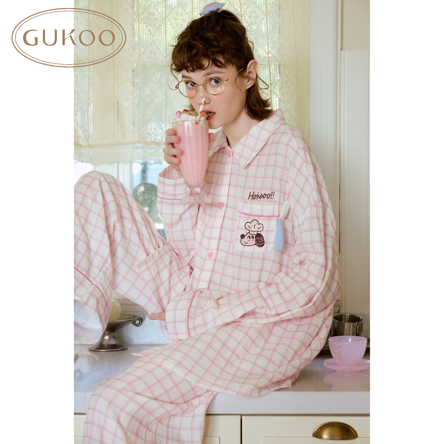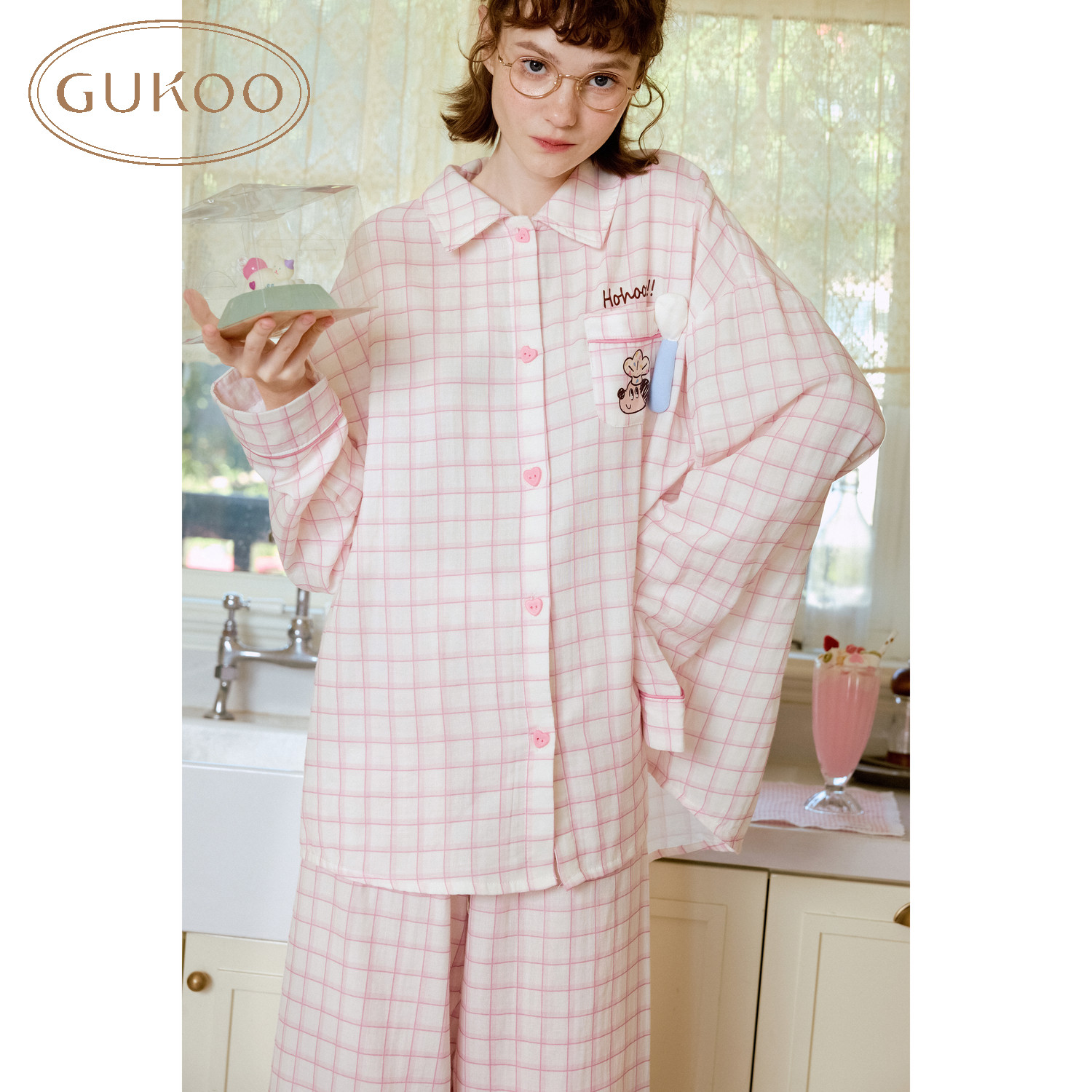 纯棉格子女士家居服套装 Gukoo 果壳睡衣女春夏轰轰小狗印花新款