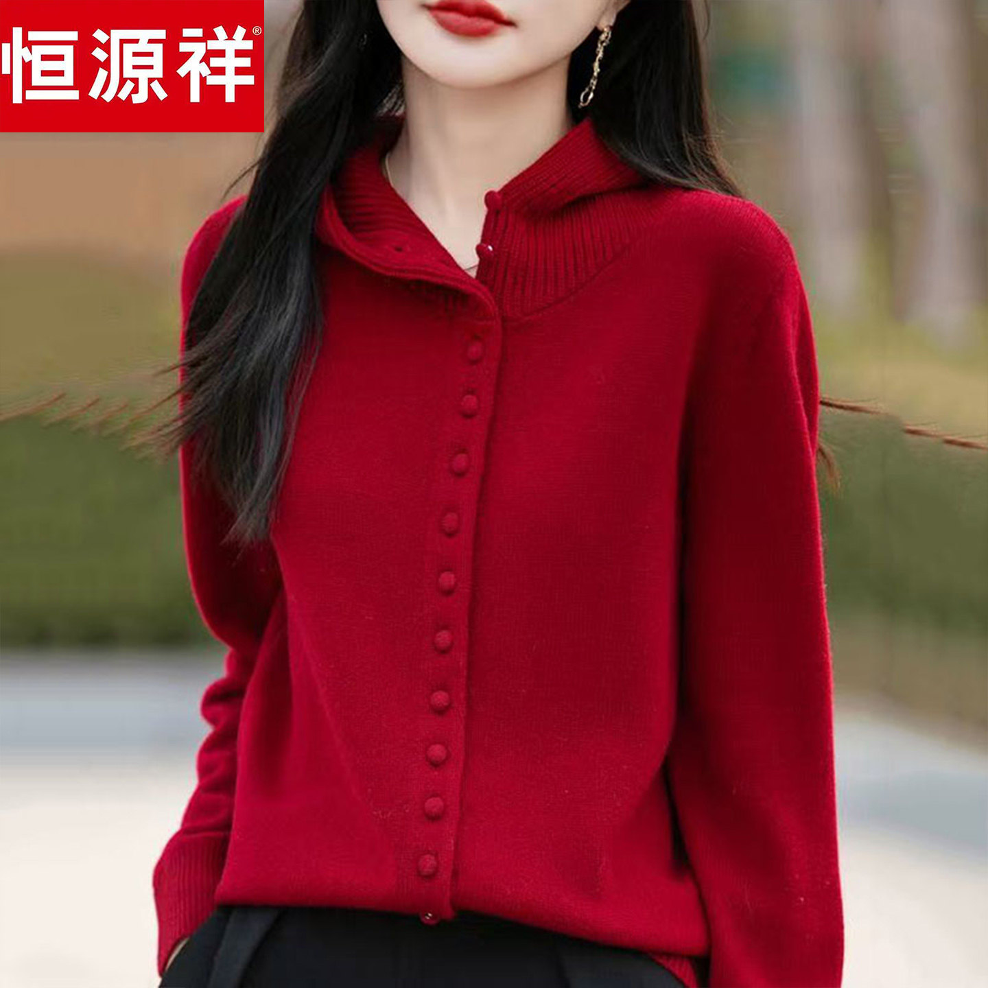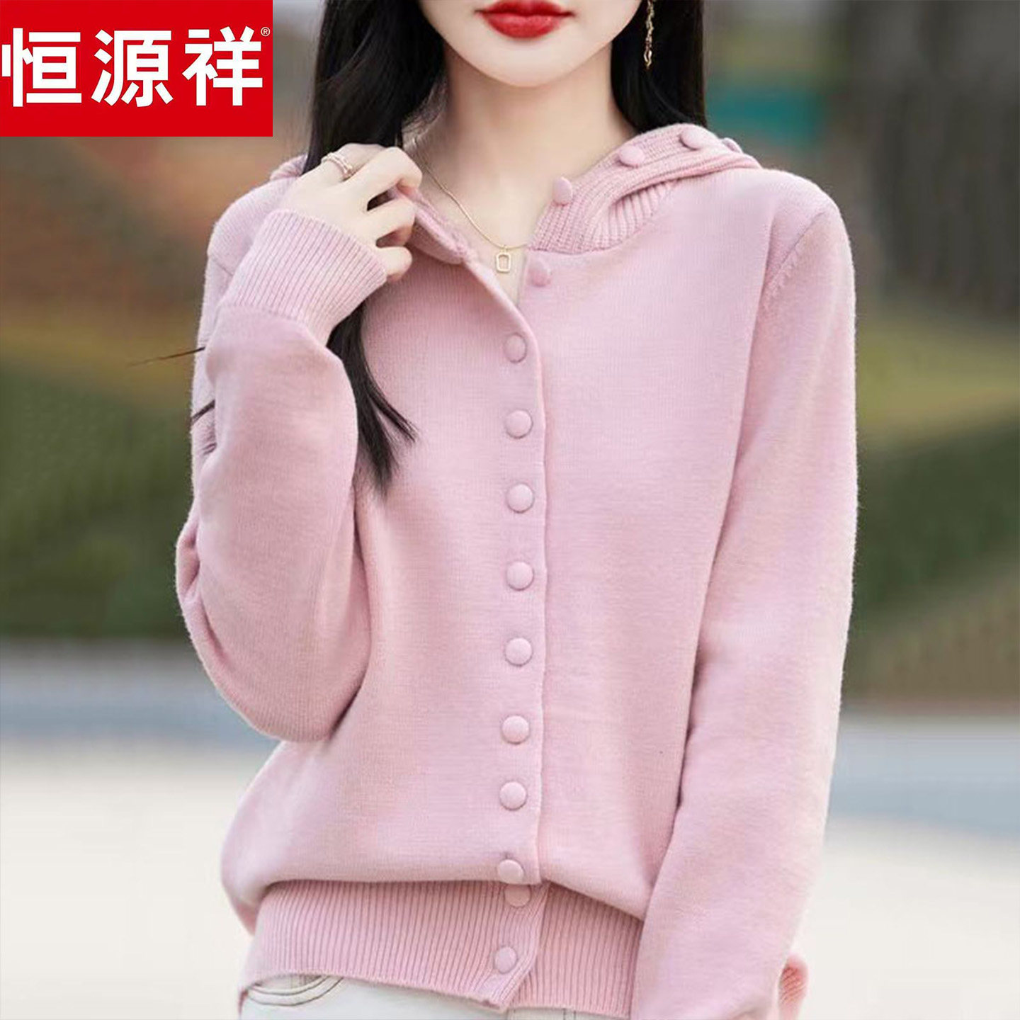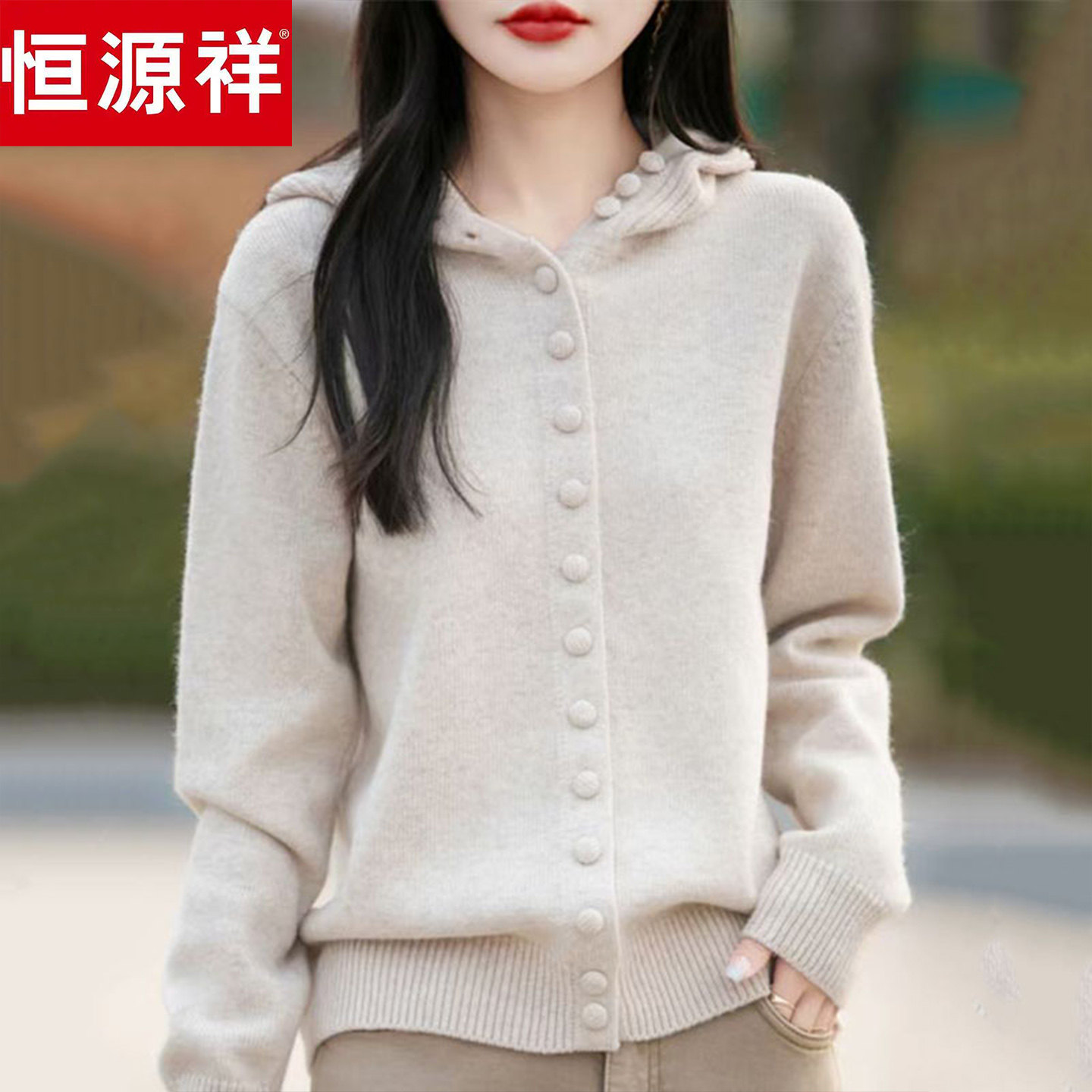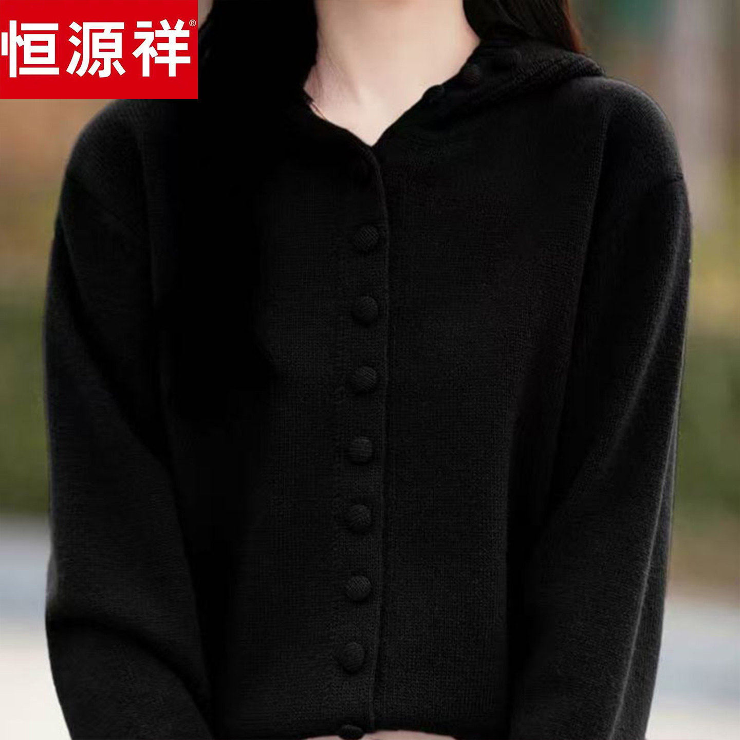 外套宽松加厚单排扣毛衣上衣 连帽针织开衫 恒源祥羊毛衫 女秋冬新款
