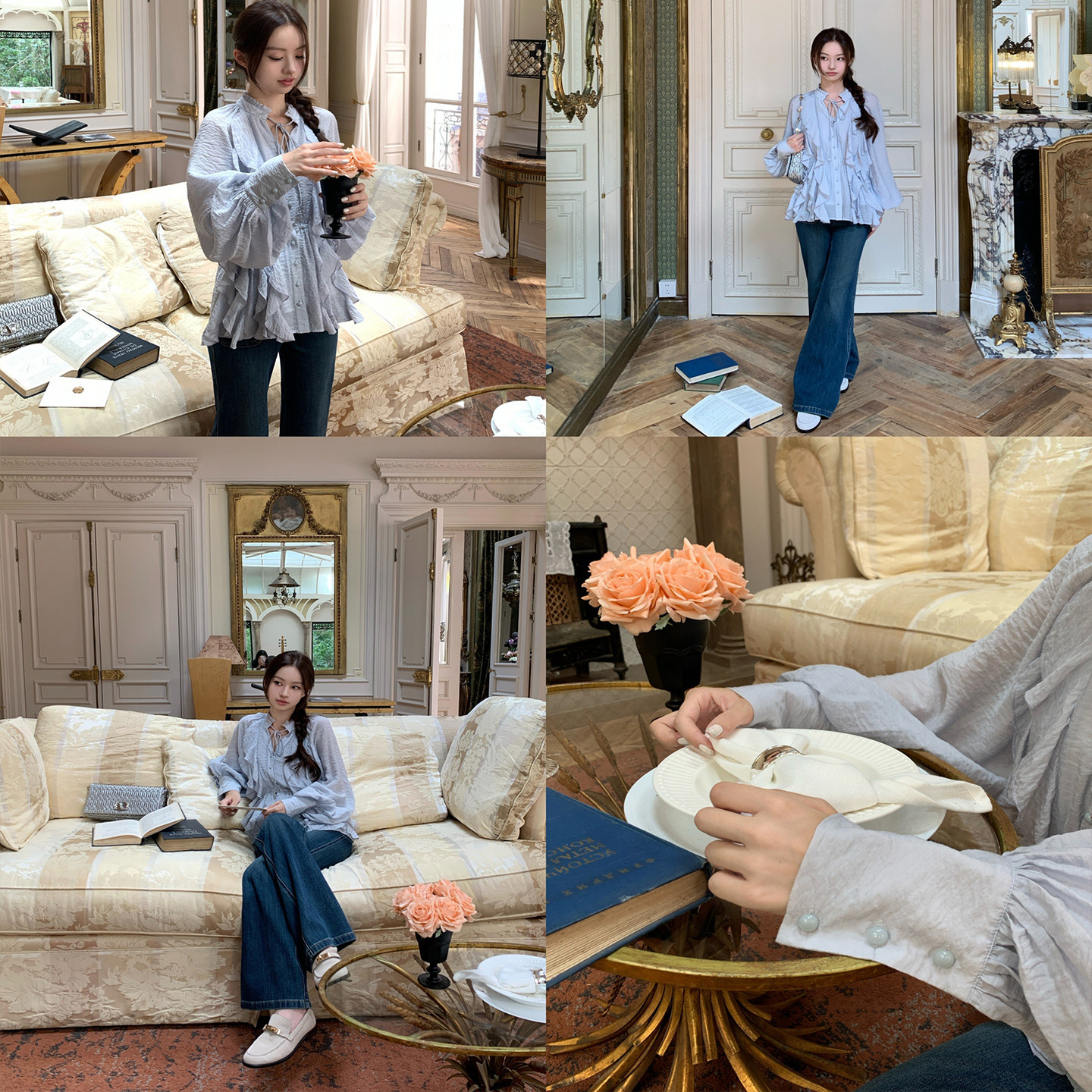 系带衬衫 3色水波纹肌理绉荷叶边灯笼袖 女 韩系白月光 SourceWithU