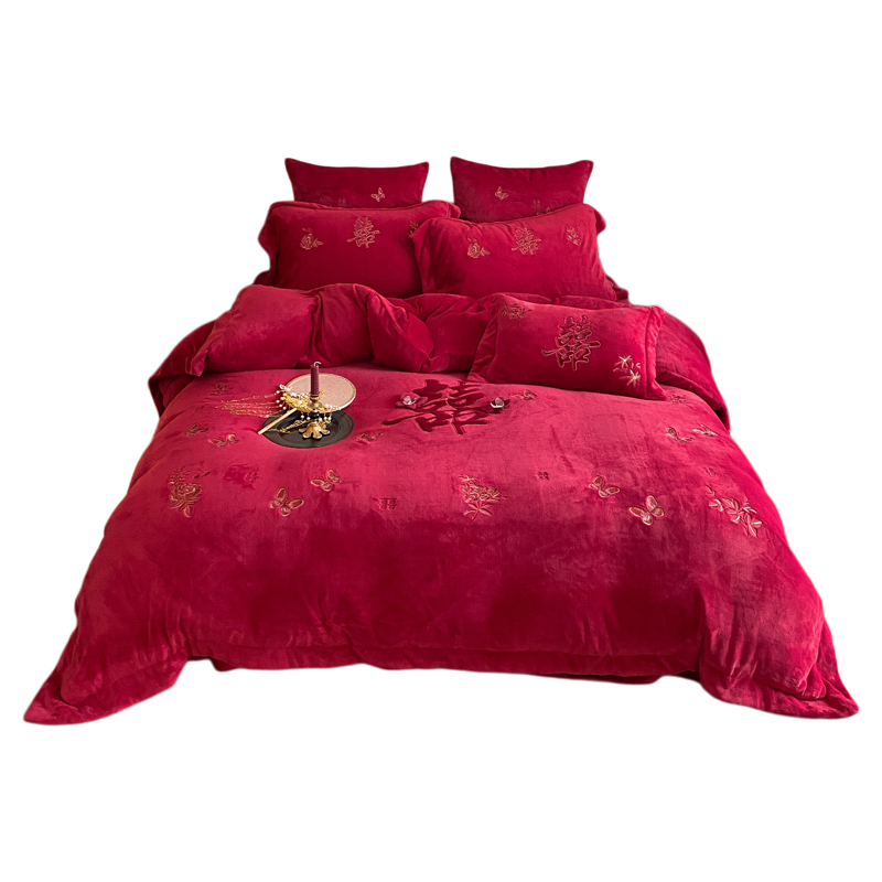 保暖冬款 牛奶绒结婚四件套蝴蝶双喜刺绣红色珊瑚绒备婚房被套床单