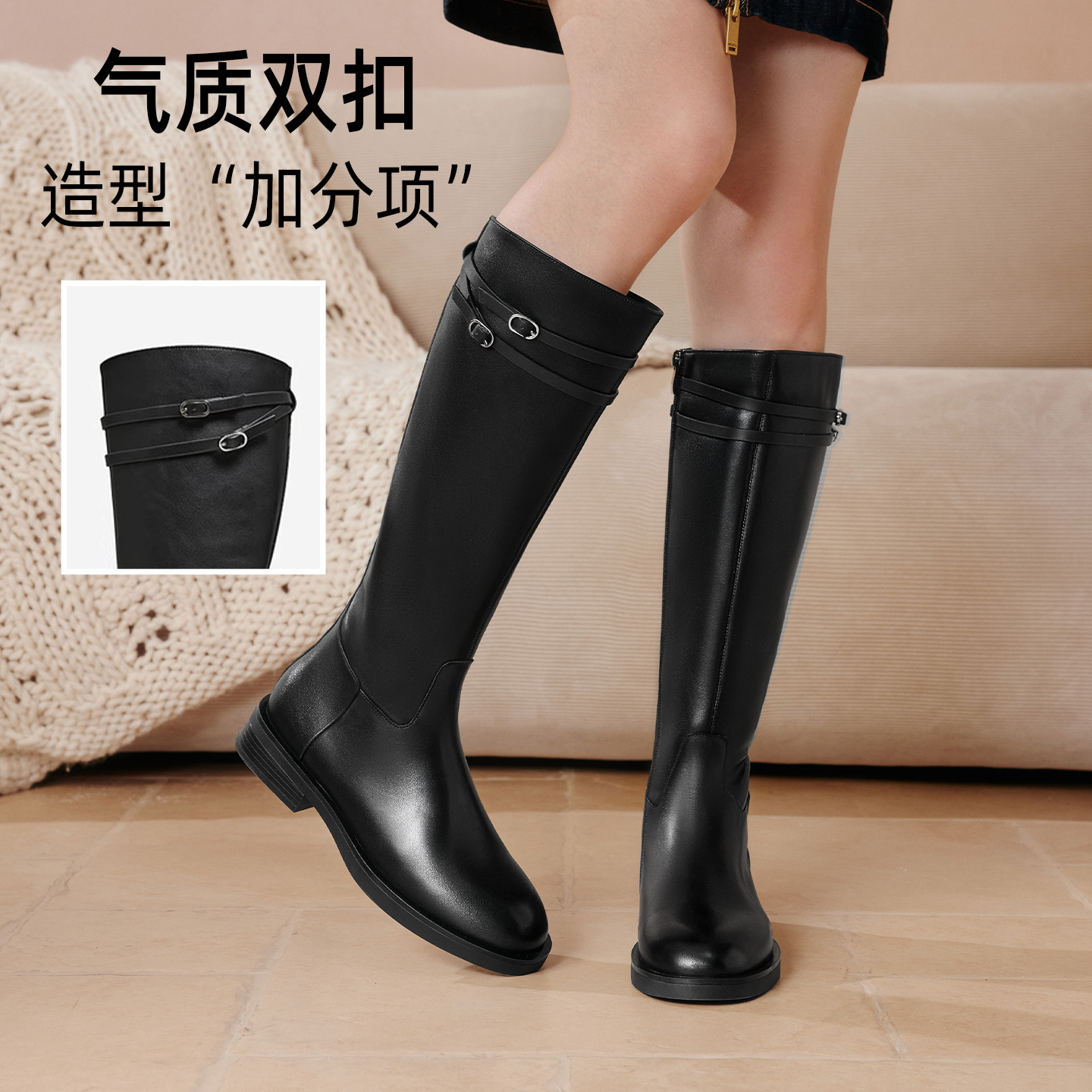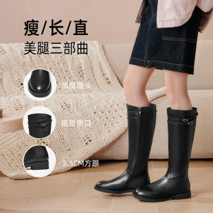百思图2025冬季 牛皮骑士靴复古显瘦粗跟女高筒长靴W6563DG5 新款