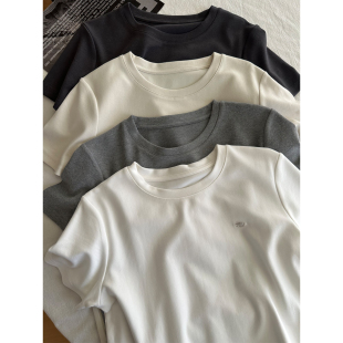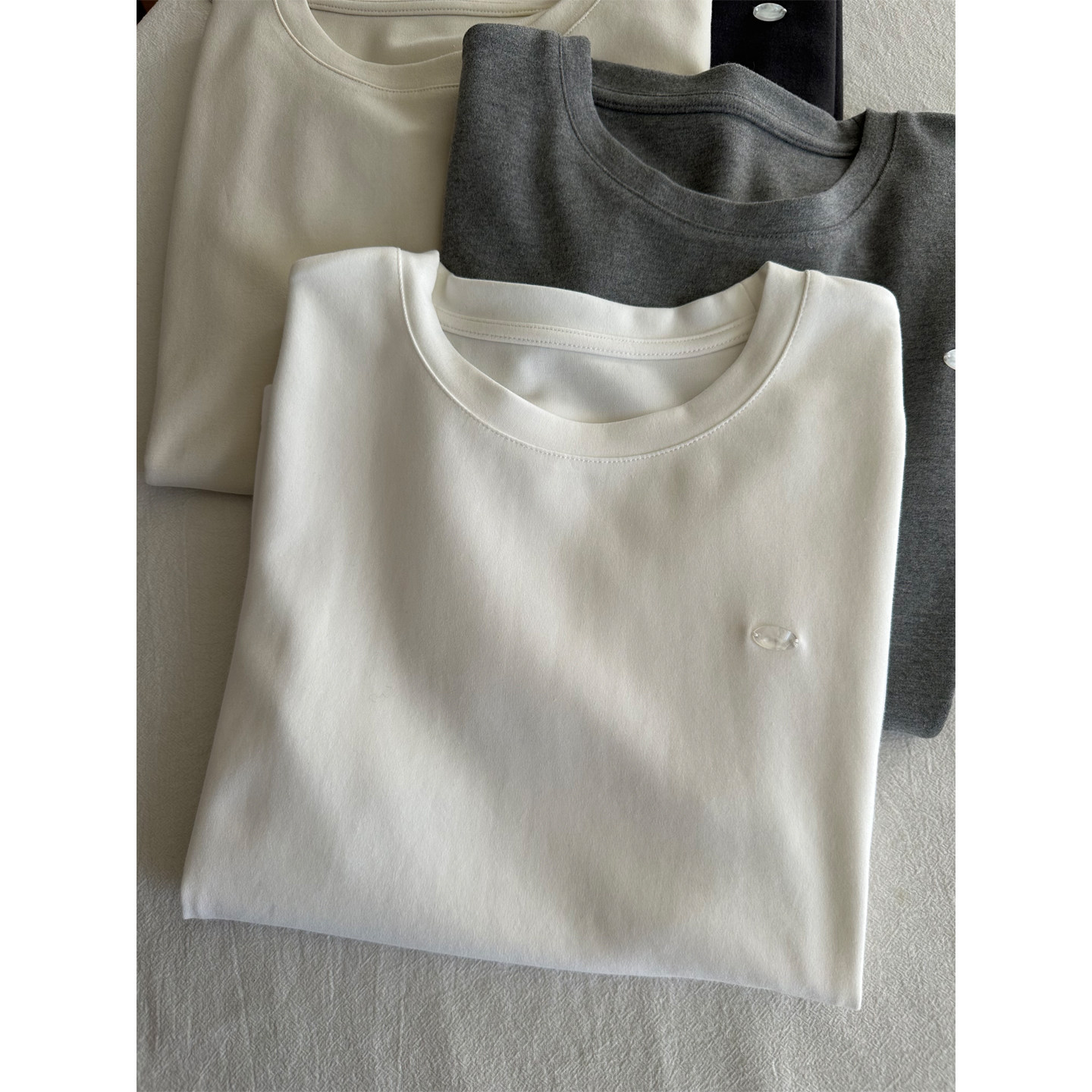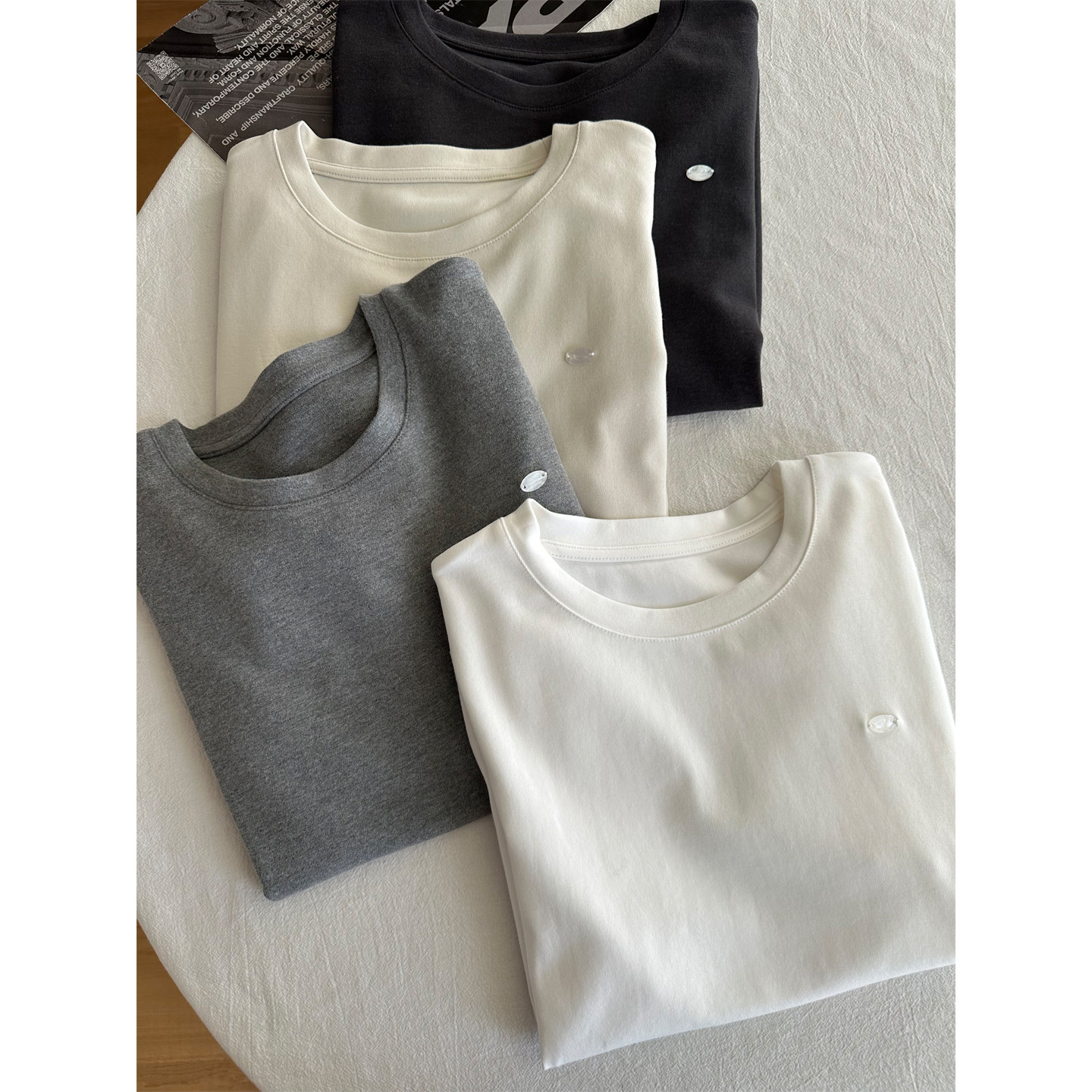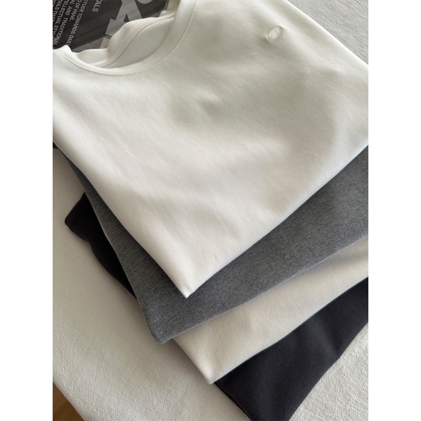 上衣 T恤女显瘦百搭圆领正肩短袖 秋款 磨毛感云朵绒小扣子设计韩版