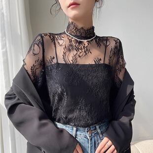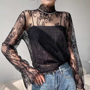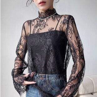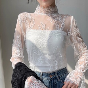 透明立领蕾丝打底衫 网纱上衣 女春秋洋气内搭性感纱衣睫毛喇叭长袖