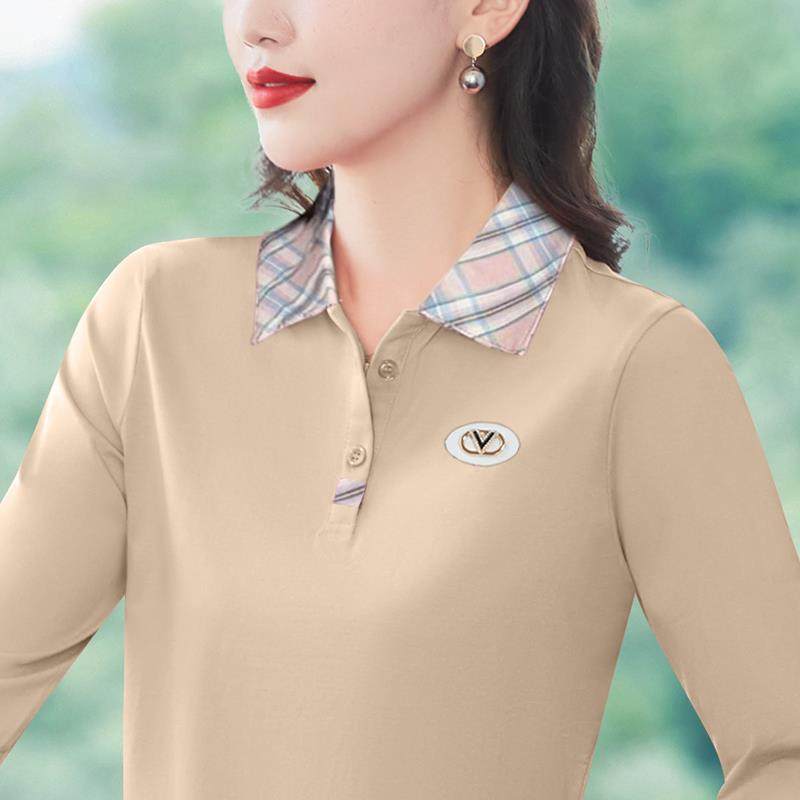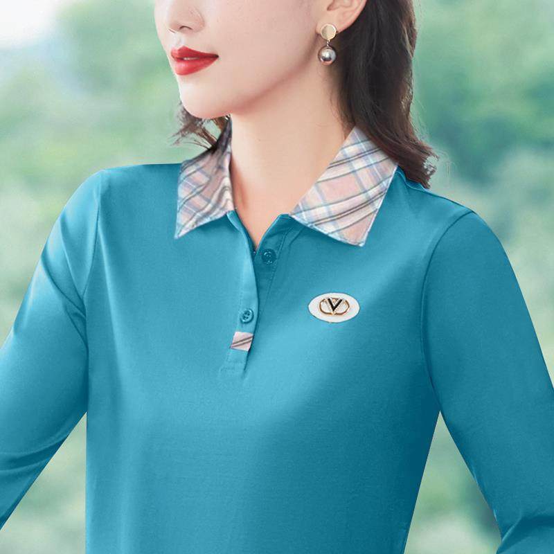 女拼接磨毛打底长袖 显瘦翻领刺绣POLO衫 上衣 假两件修身 FISSXS