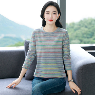 新款 外穿条纹打底衫 大码 T恤女装 上衣洋气 宽松纯棉长袖 2025早秋装
