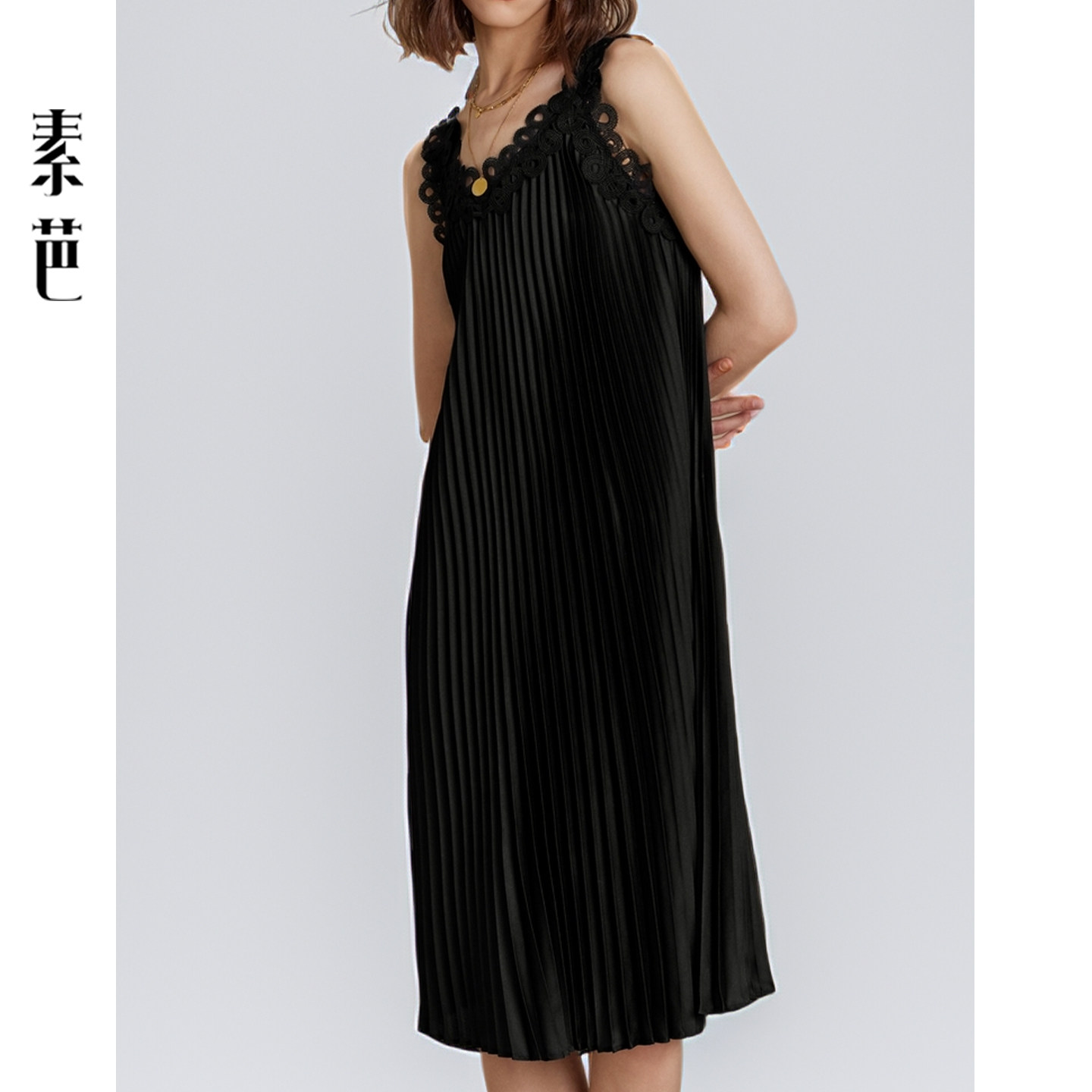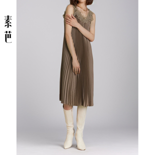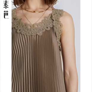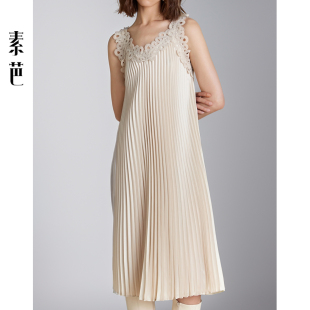 素芭艺术感压褶连衣裙女秋季 百搭休闲镂空蕾丝吊带裙SF0687 时尚
