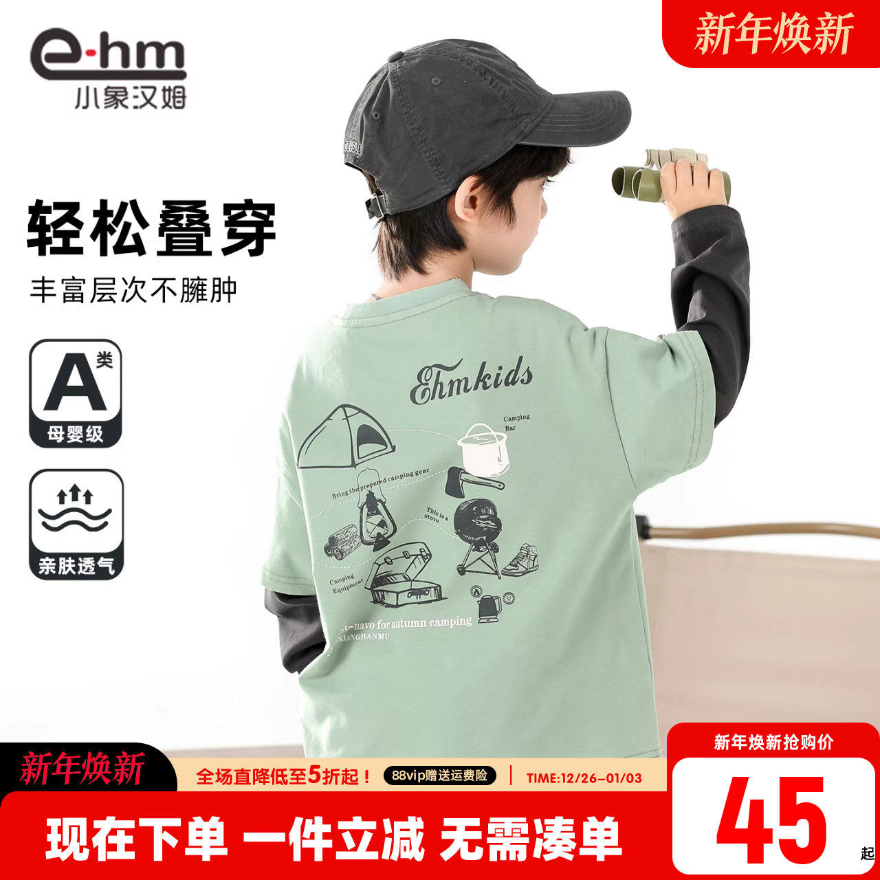 新款 小象汉姆童装 2025秋装 T恤假两件儿童全棉打底衫 洋气 男童长袖