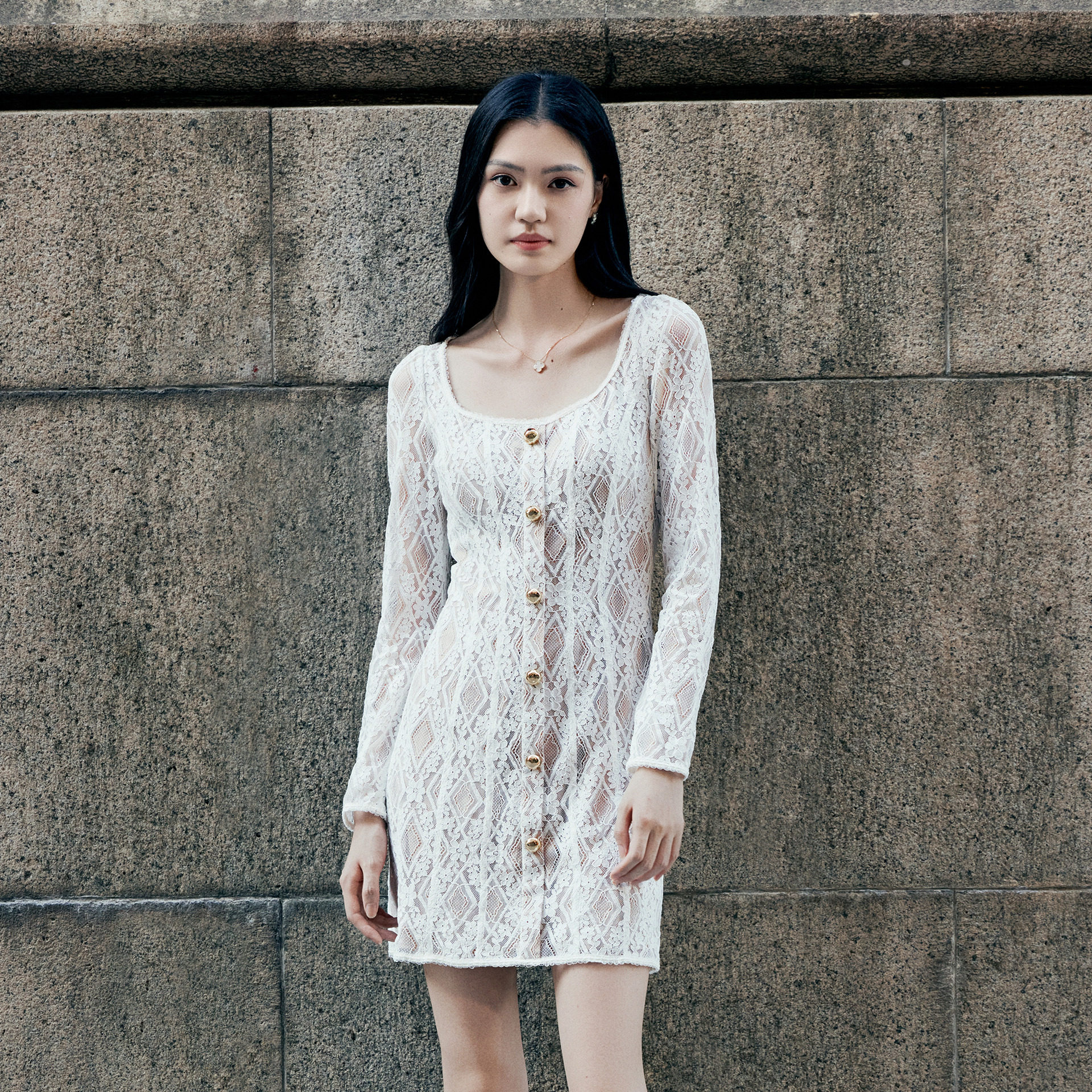 长袖 女士白色小香风蕾丝收腰修身 连衣裙350006 新款 bebe2025秋季
